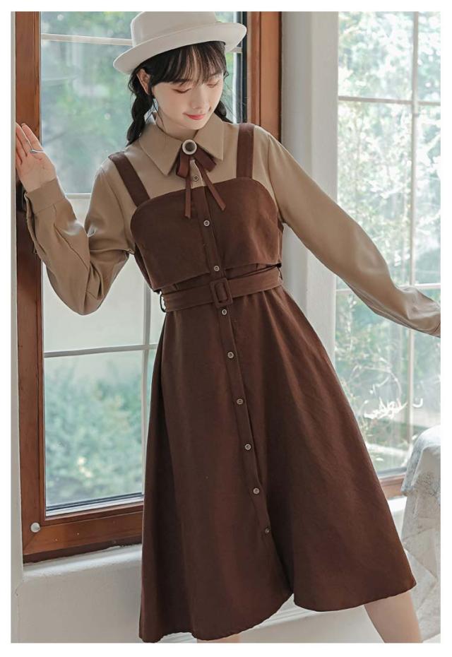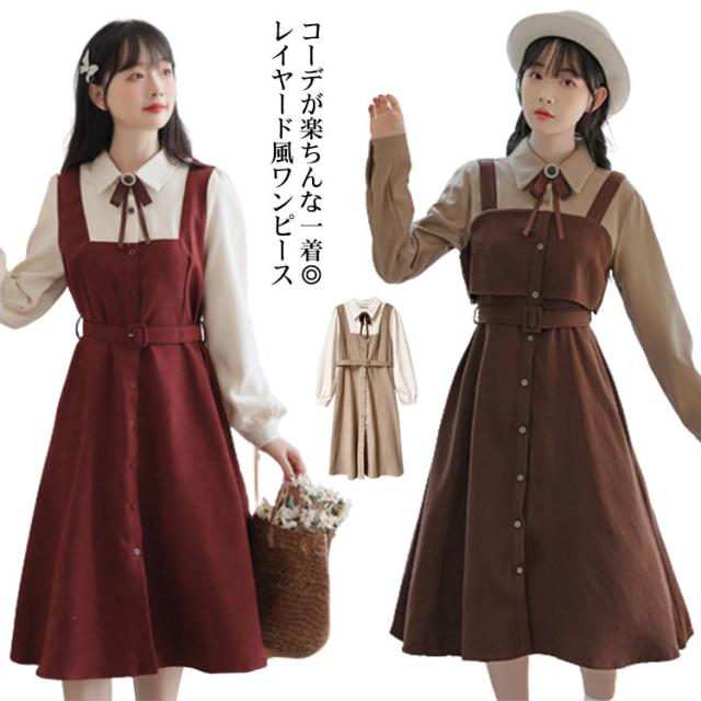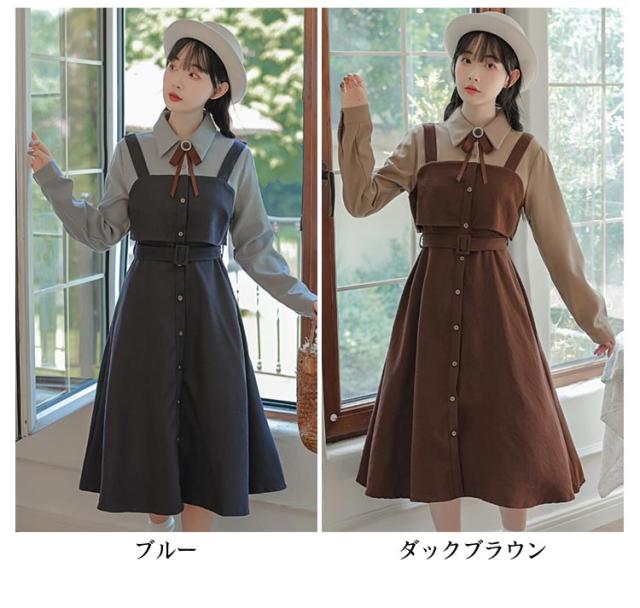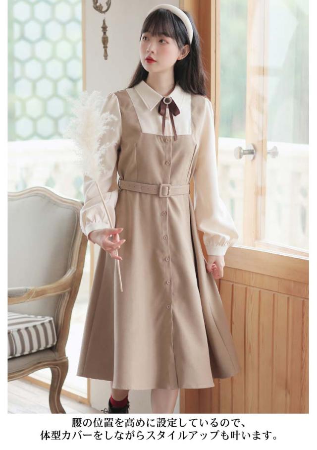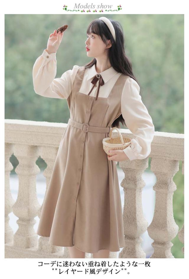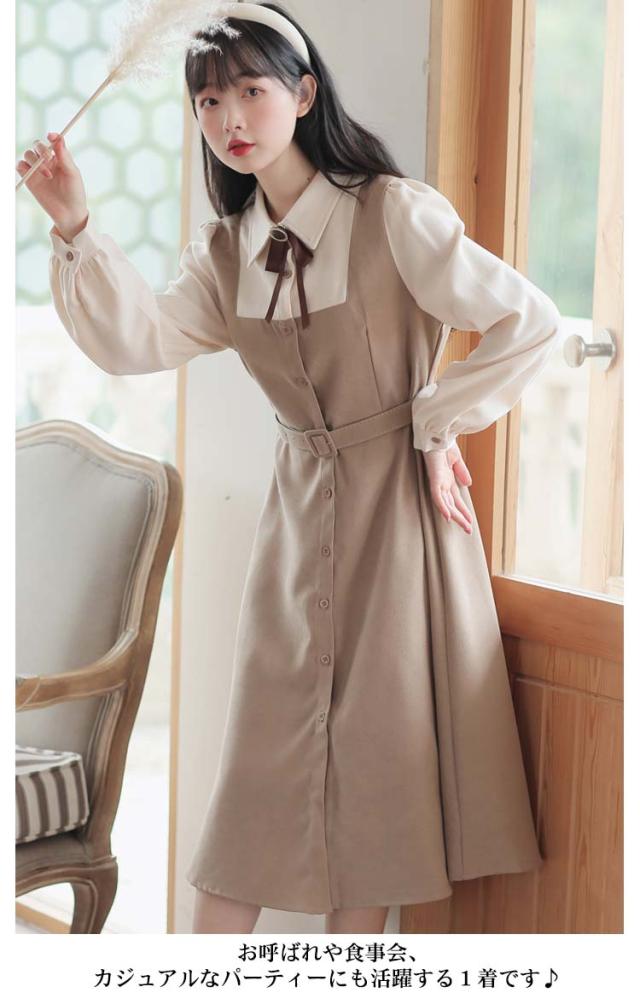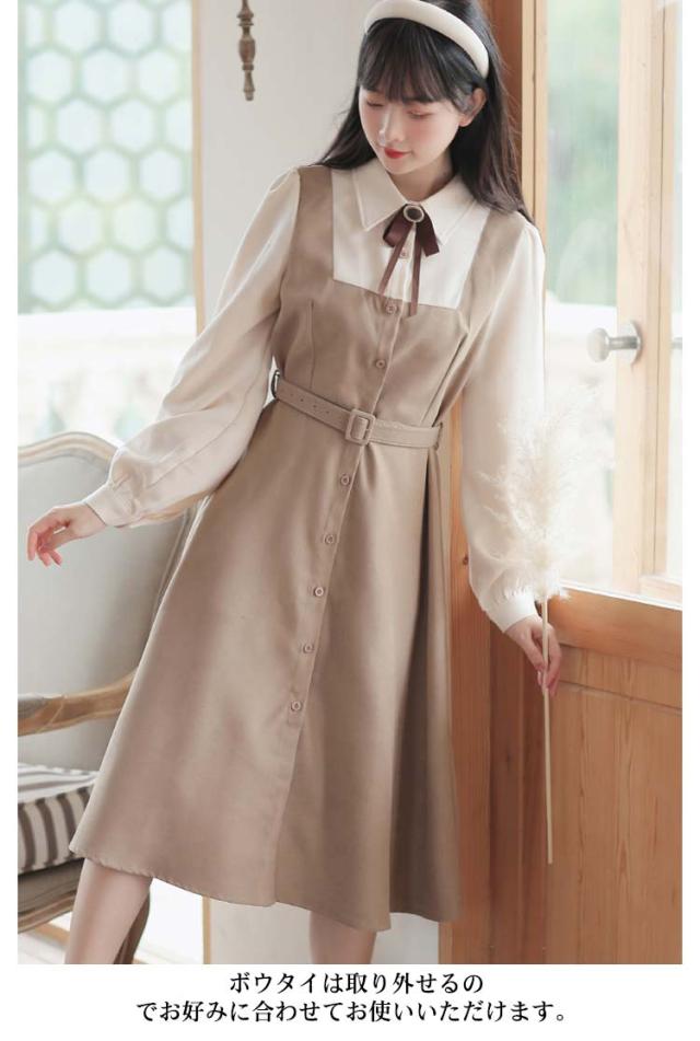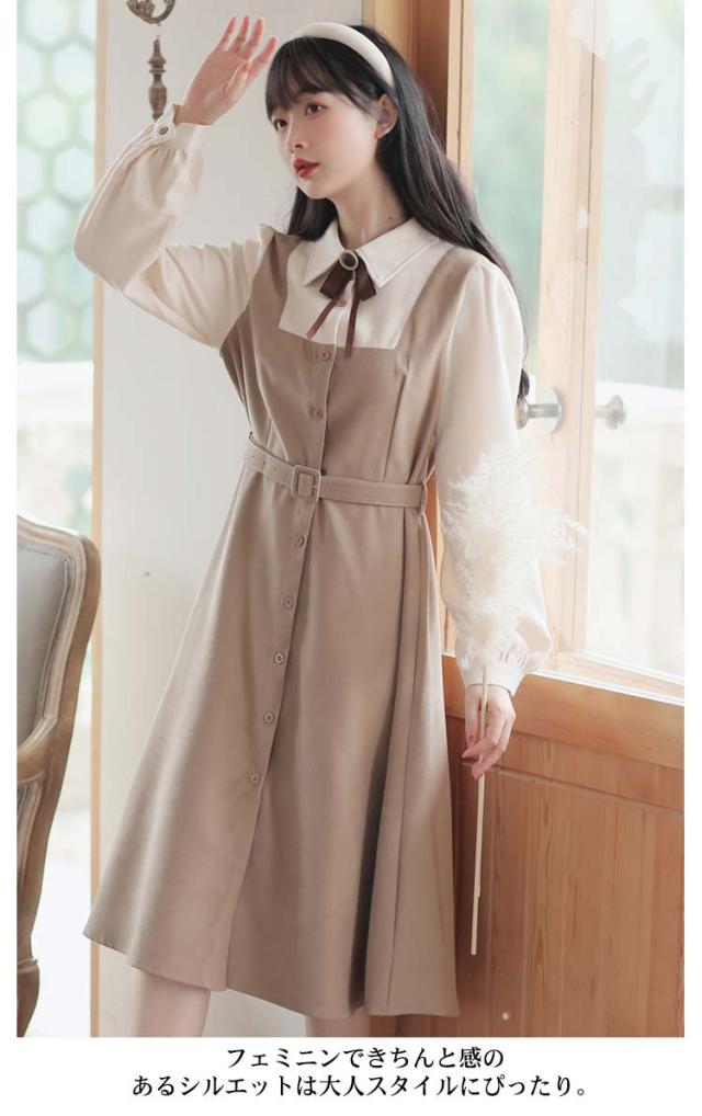 送料無料 ワンピース ミモレ丈 春秋 レディース ドッキングワンピース シャツワンピース 上品 長袖 ボウタイワンピース 重ね着風 レイヤード風 切り替え ウエストベルト付き フェミニン ナチュラル Aライン お出かけ 通勤 オフィス OL 大人