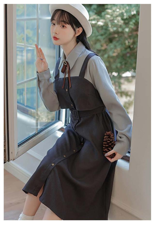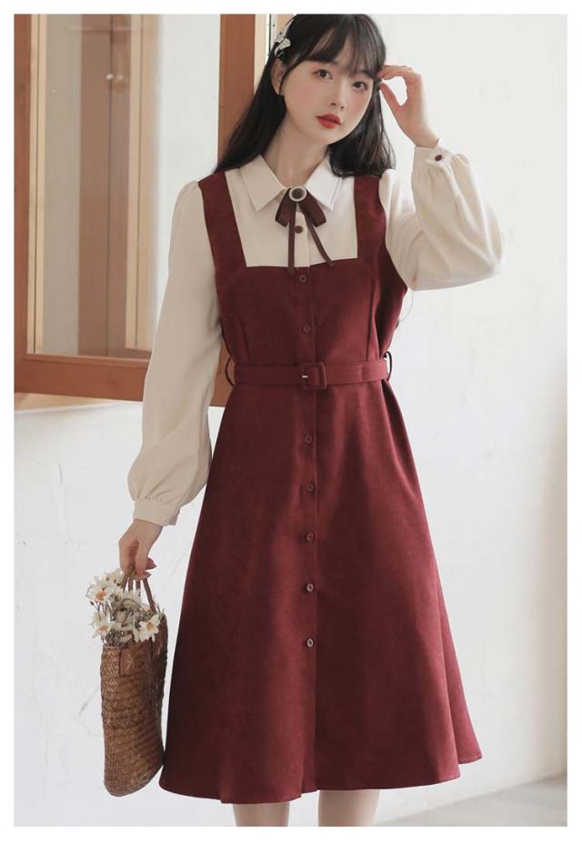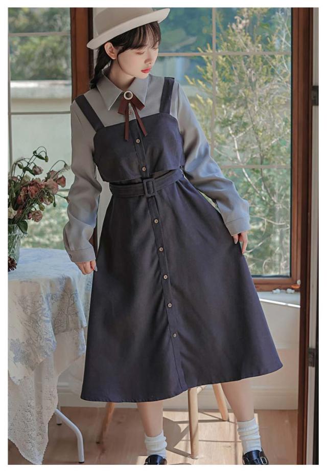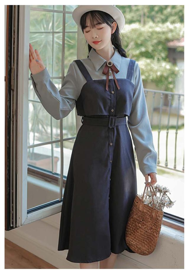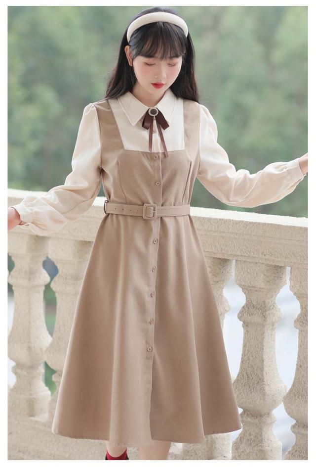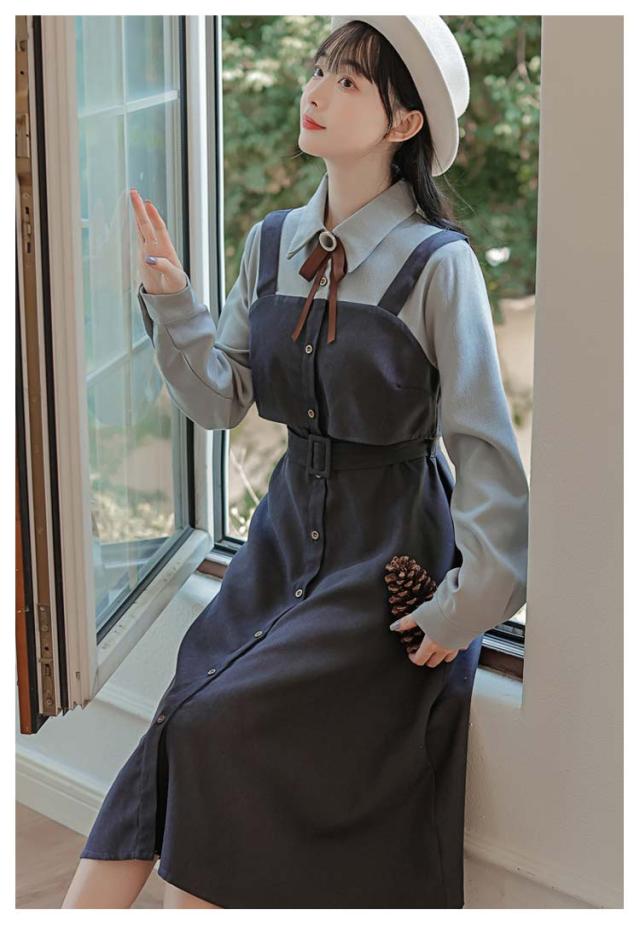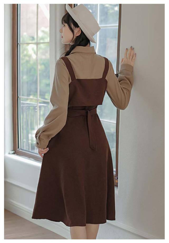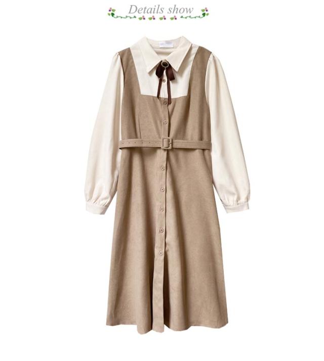 送料無料 ワンピース ミモレ丈 春秋 レディース ドッキングワンピース シャツワンピース 上品 長袖 ボウタイワンピース 重ね着風 レイヤード風 切り替え ウエストベルト付き フェミニン ナチュラル Aライン お出かけ 通勤 オフィス OL 大人