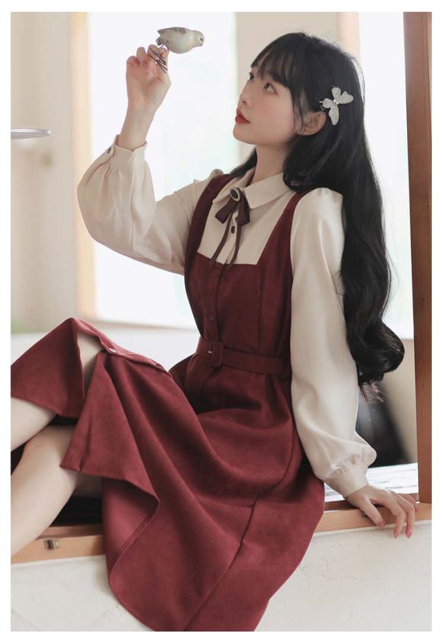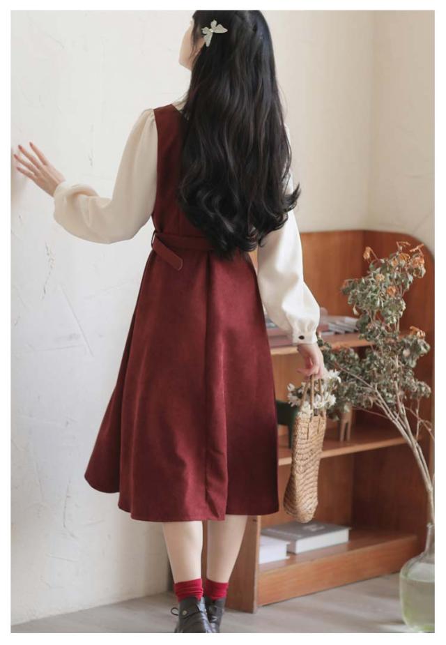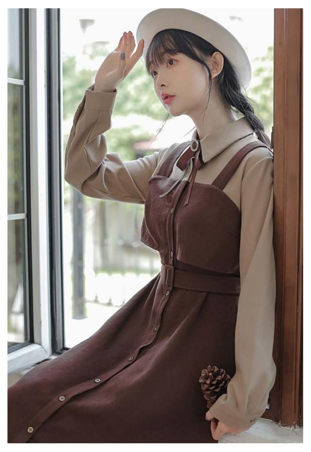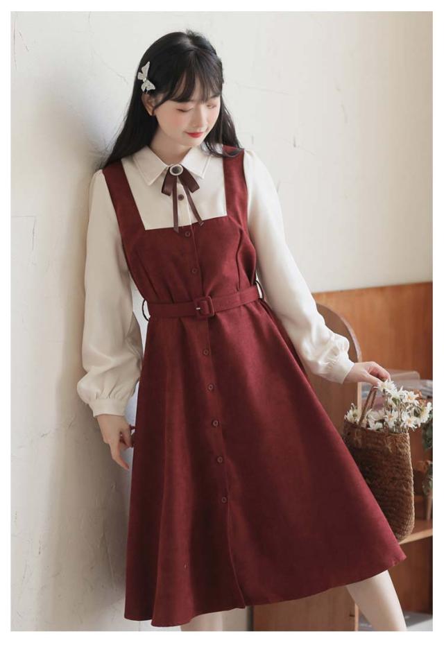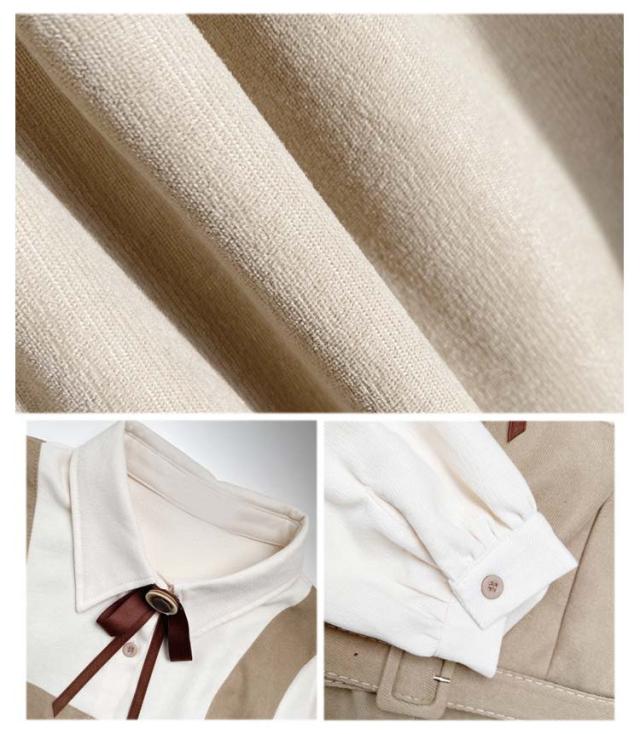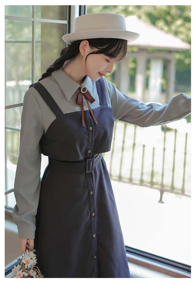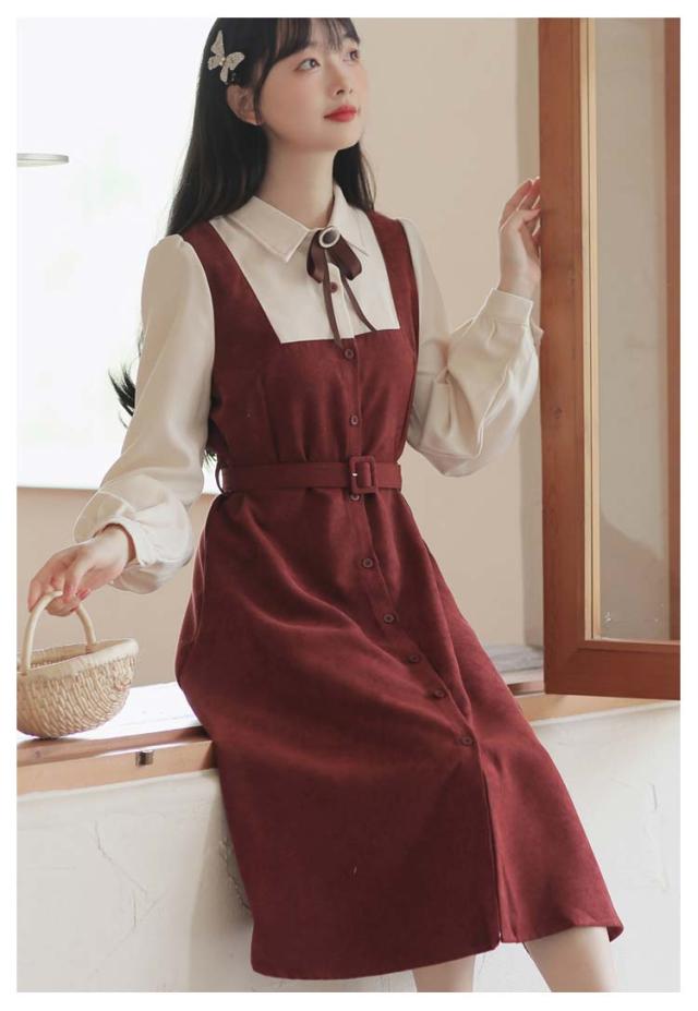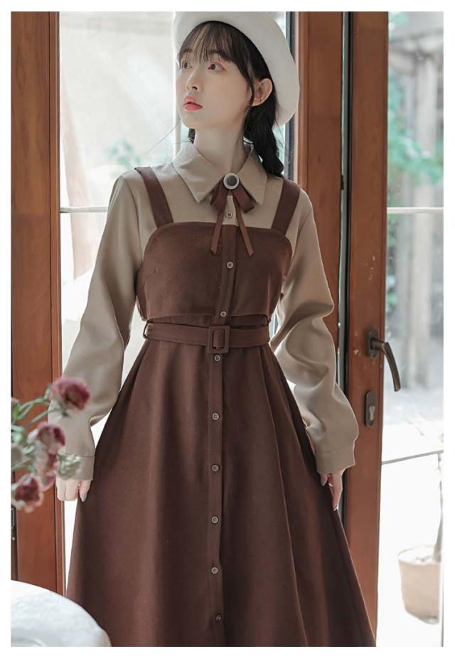 送料無料 ワンピース ミモレ丈 春秋 レディース ドッキングワンピース シャツワンピース 上品 長袖 ボウタイワンピース 重ね着風 レイヤード風 切り替え ウエストベルト付き フェミニン ナチュラル Aライン お出かけ 通勤 オフィス OL 大人