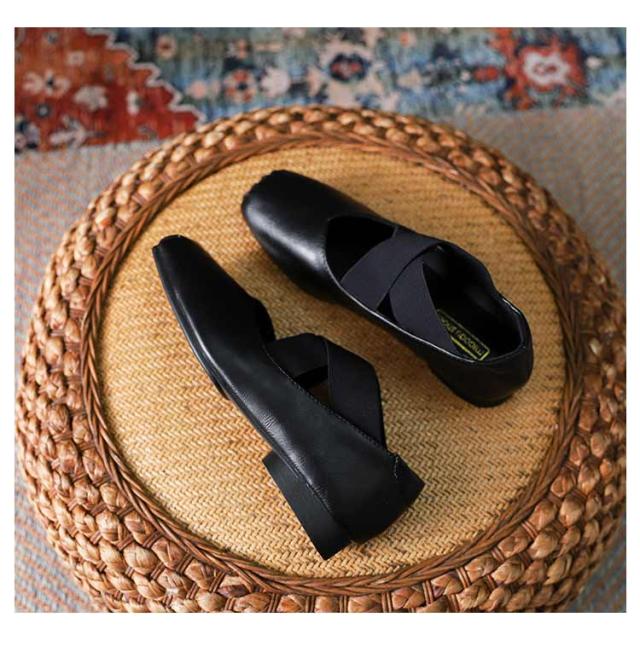 | クラシックなバレエシューズにモダンな雰囲気をプラスしたバレエシューズ。 ワイド目なスクエアトゥでつま先のあたりが痛くなりにくいのみ魅力のひとつ カジュアルに見えがちなワイドスクエアも甲のVカットが女性らしい印象をプラスしてくれています クロスのベルトはゴム製で足にフィットし、脱げにくく楽に履いていられます アッパーには肌馴染みの良い素材のレザーを使用しております。 フラット底で履きやすくて歩きやすいです。 素足でも、ソックスに合わせてもシーズンレスにスタイリングを楽しめます。 | |