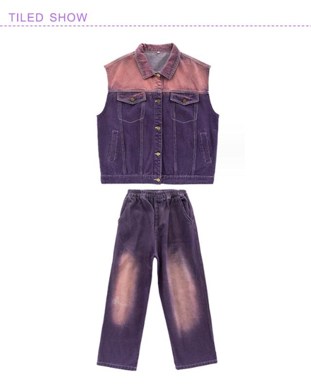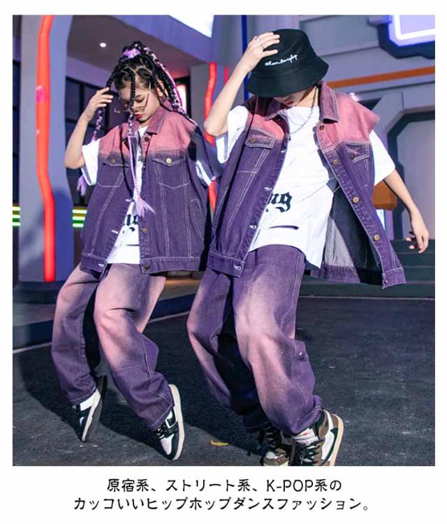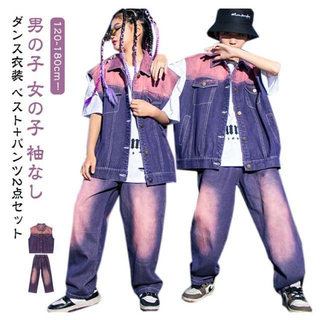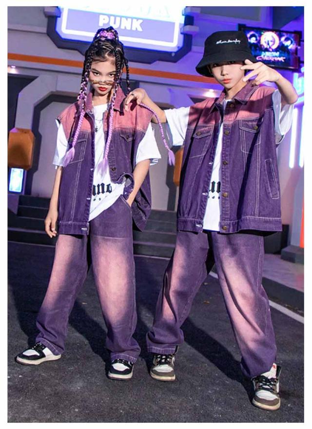 キッズ ダンス衣装 ヒップホップ 紫 デニム ベスト ロングパンツ 絞り染め セットアップ 男の子 女の子 ジャズダンス 袖なし デニムシャツ 長ズボン 2点セット 子供 ジュニア かっこいい ゆったり 団体服 応援団 イベント 発表会 文化祭 演出服 体育祭 120-180cm
