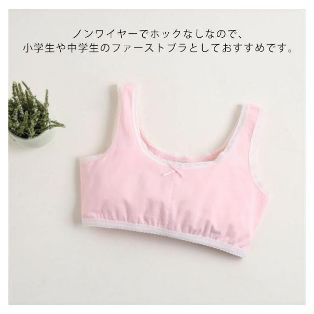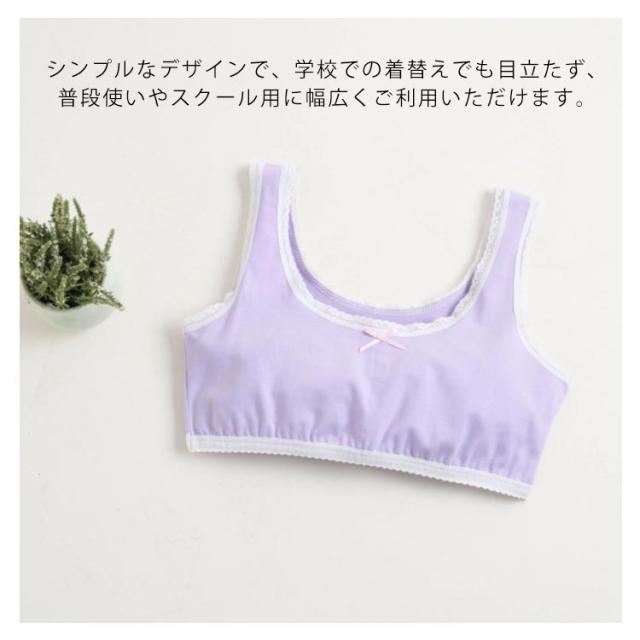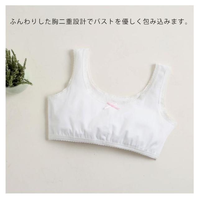 | 普段のインナーと変わらない着心地とかわいらしさではじめてのブラを応援します♪ 通気性がよくやわらかな肌触りで、お肌にやさしく快適な着心地。 前身ごろ胸部は二重になっていてやさしくふんわりとバストをガードします。 ストレッチ性がある素材だから身体にぴったりフィットするインナーです。 | |
