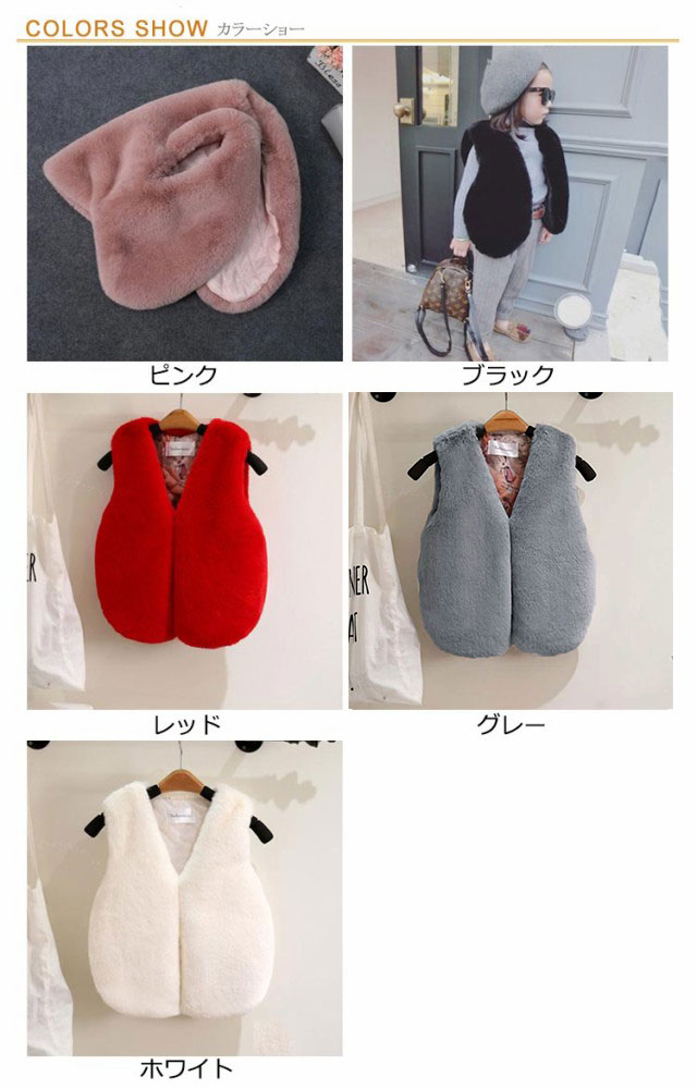 ファーベスト 女の子 フェイクファー キッズ ベスト アウター ピンク ブラック レッド グレー ホワイト 黒 白 韓国 子供服 子ども服 おしゃれ 重ね着 お出かけ 旅行 防寒 春 秋 冬 保育園 幼稚園 通園 小学校 通学 80cm 90cm 100cm 110cm 120cm 130cm 140cm 150cm