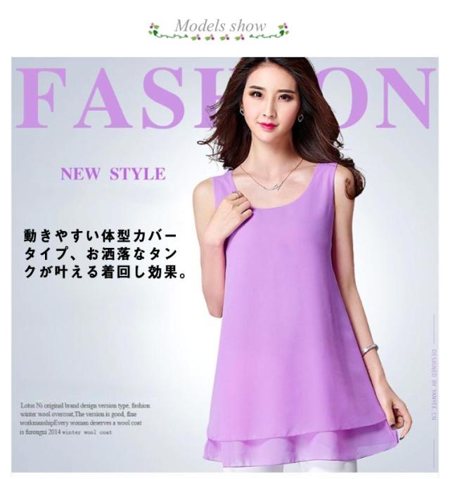 | 二重シフォン生地にもこだわり、柔らかい生地タンクトップ。 動きやすい体型カバータイプ、お洒落なタンクが叶える着回し効果。 これさえあれば、もう迷わない。 羽織のインナーとしても重ね着スタイルにも、魅力を発揮してくれる、カジュアルシルエット! オシャレなレイヤードスタイルが即完成しちゃう優秀アイテムです。 シンプルで品があり、女性らしい印象なので、お出かけはもちろんオフィスにもおすすめです。 | |