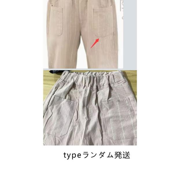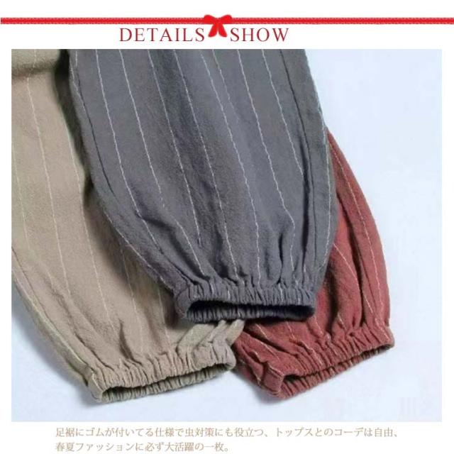 | 可愛いストライプ綿麻パンツ。 爽やかな綿麻素材にゆったりとしたシルエットで春夏に最適な履き心地。 ウエストがゴムなので楽ちんです。 足裾にゴムが付いてる仕様で虫対策にも役立つ、トップスとのコーデは自由、春夏ファッションに必ず大活躍の一枚。 普段着だけでなく部屋着としてもおすすめです。 | |