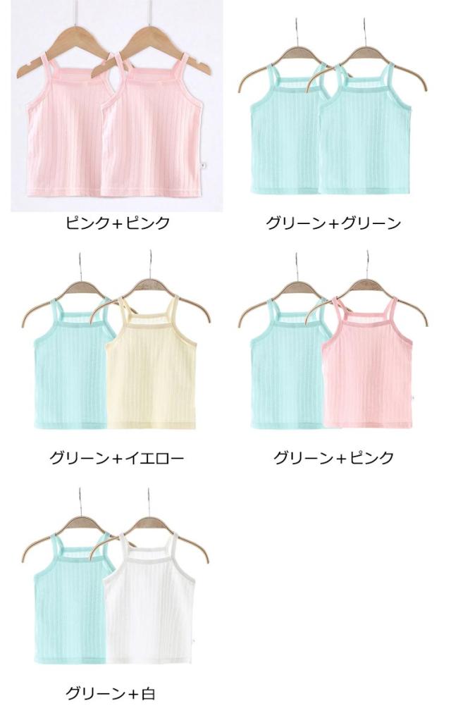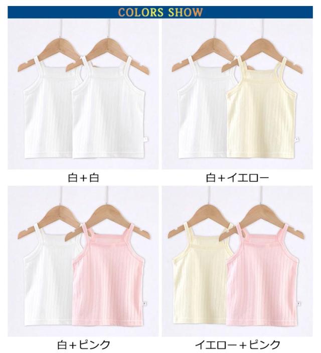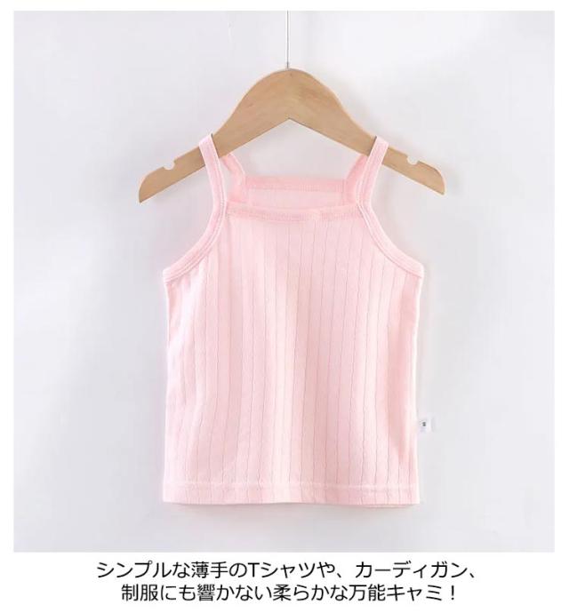 | キッズ用キャミソール2枚セット 伸びが良いのでお着替えしやすく、洗濯してもへたりにくいのがうれしいポイントです。 伸縮性もよく、締め付け感なし! 汗をよく吸って、べたつかない、一日中さらっと肌触り! シンプルな薄手のTシャツや、カーディガン、制服にも響かない柔らかな万能キャミ! ダンス発表会や、部屋着、普段着のインナーとしても最高! | |