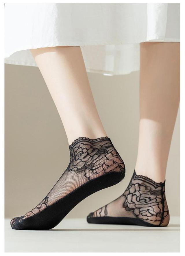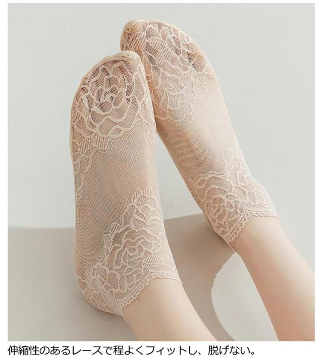 | 【5足セット】 【花柄シースルレースで透け感が楽しめるおしゃれ】 フェミニンな足元を演出してくれるレースソックス。 パンプスやローファーなど様々なシューズにマッチできるおしゃれな靴下。 伸縮性のあるレースで程よくフィットし、脱げない。 底面は綿素材で、通気性よく、滑りにくいから履き心地がGOOD! | |