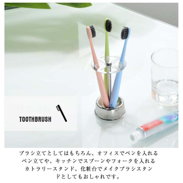 | 清潔感のあるステンレス製の歯ブラシスタンド。 差し込む場所がそれぞれ分かれており、足元は内側に寄っている形状のため、ブラシ同士が接触しにくい作りになっています。 くぼんだ形をした底面は、歯ブラシの水滴をしっかりと受け止め、洗面台に水分が落ちるのを防いでくれます。 ステンレス製なので、カビや汚れ、臭いも付きにくく衛生的。 丈夫で劣化もしにくいので長くお使い頂けます。 ブラシ立てとしてはもちろん、オフィスでペンを入れるペン立てや、キッチンでスプーンやフォークを入れるカトラリースタンド、化粧台でメイクブラシスタンドとしてもおしゃれです。 清潔感のあるシンプルなデザインは、いつもの洗面台周りを明るく、おしゃれな空間へと整えてくれます。 | |