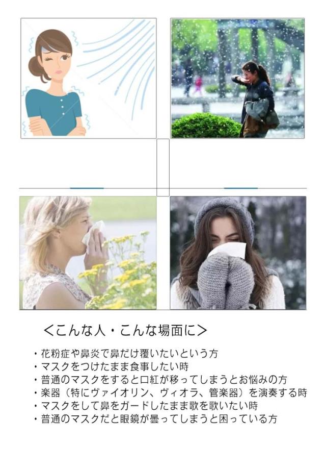 | 乾燥や花粉の季節にピッタリな鼻だけマスク、メガネ曇りを軽減し、テレワークにおすすめです。 【20枚入り】 鼻をふんわり包み込み、長時間つけても息苦しくなく快適です。 耳ヒモは柔軟性のある素材を使用しているので耳への負担を軽減。 アジャスター付きで耳ひもの長さの調節が可能です。 不織布は通気性にも優れているので睡眠中も息苦しくありません。 <こんな人・こんな場面に> ・花粉症や鼻炎で鼻だけ覆いたいという方 ・マスクをつけたまま食事したい時 ・普通のマスクをすると口紅が移ってしまうとお悩みの方 ・楽器(特にヴァイオリン、ヴィオラ、管楽器)を演奏する時 ・マスクをして鼻をガードしたまま歌を歌いたい時 ・普通のマスクだと眼鏡が曇ってしまうと困っている方 | |