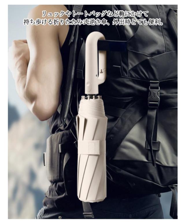 | カラビナバックル持ち手、どこでもかけられる♪折りたたみ傘と逆さま傘のいいとこ取りの折りたたみ逆さま傘。直径125cm リュックやトートバッグなど鞄にかけて持ち歩ける折りたたみ式逆さ傘、外出時とても便利。 水滴が内側に収納される逆さ傘、洋服や荷物が濡れることなくて周りの人にも迷惑なし。車の座席に置いても車内が濡れない。 手元のボタンを押すと、ワンタッチ自動開きます。 折りたたみ式なので出張、旅行の携帯用として、車の中に常備していると大変便利。 高密度で防水性の高い布地を採用されたことにより、撥水性に優れています。水滴がかさに落ちた瞬間に水玉になりコロコロと滑り落ちていく。 内側には遮光遮熱コーティングを施され、日差しの強い日は光を通さずUVカットしてくれるので、雨の日だけでなく、暑い季節の通勤に日傘としても活用可能。 | |
