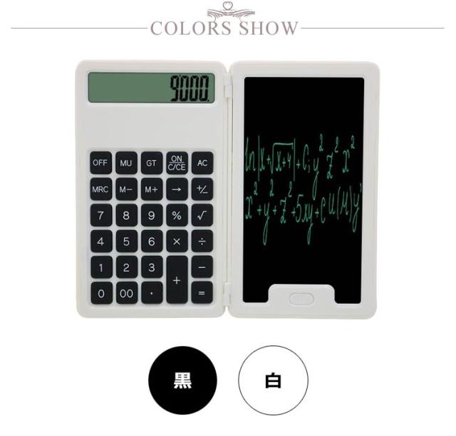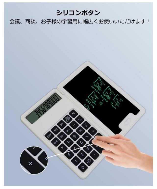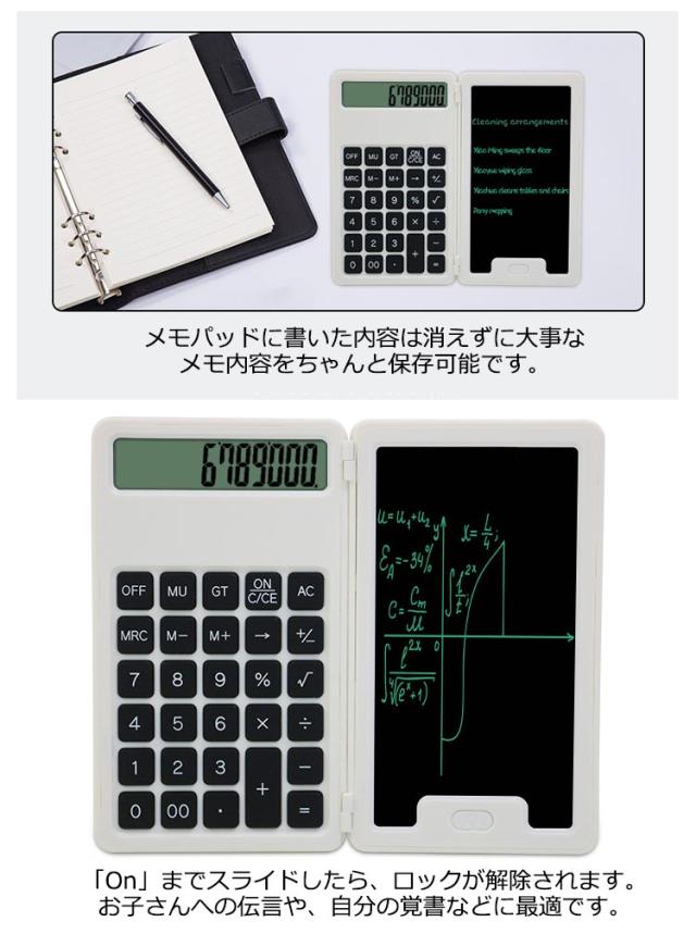 | 電子メモパッドになんと!電卓がドッキング!! 紙を消費せず、ごみも出ないエコな電子メモパッドです! 電卓で出した算出結果を隣のメモパッドに残せるので計算を繰り返すシーンに最適です! 軽くてコンパクトに折り畳めて、ポケットやカバンにすんなり入れて、持ち運びに便利です。 計算用の電卓、記録用のペン、紙、などは電卓メモパッドを持っていれば全部不要です。 電卓側の下にメモロック付き。ボタンを「Lock」までスライドしたら、メモ消去ボタンを押しても、 メモパッドに書いた内容は消えずに大事なメモ内容をちゃんと保存可能です。 「On」までスライドしたら、ロックが解除されます。お子さんへの伝言や、自分の覚書などに最適です。 会議、商談、お子様の学習用に幅広くお使いいただけます! | |