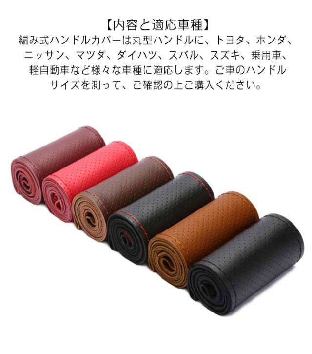 | 【編み込み式ハンドルカバーの特長】取り付け後にカバーに隙間ができないので指が引っかかったり違和感がない。ホコリなどの汚れが隙間に入り込まないので衛生的。太くなり過ぎないので運転していても疲れにくい。 ウレタンハンドルと違い、冬は冷たくない、夏は触れない程熱くない。ハンドル、ハンドルカバーの劣化を防げる。 【高い耐久性】編まれたステアリングホイールカバーの接合部はしっかりとしっかりしていて、革素材はそれをより柔軟にし、長期間使用することができます。 【材質】本革の素材を使用しているので、変な匂いがしなく、柔らかくて、握るときにしっかり手になじみます。グリップ感が抜群です。滑り止めの効果もある。 【取り付け】取り付けられた針と糸でそれを縫う、ステアリングホイールのまわりでそれをラップ。絶妙で繊細な仕上がり、ファッショナブルで品質保証、効率的な滑り止め。 【内容と適応車種】編み式ハンドルカバーは丸型ハンドルに、トヨタ、ホンダ、ニッサン、マツダ、ダイハツ、スバル、スズキ、乗用車、軽自動車など様々な車種に適応します。ご車のハンドルサイズを測って、ご確認の上ご購入ください。 | |