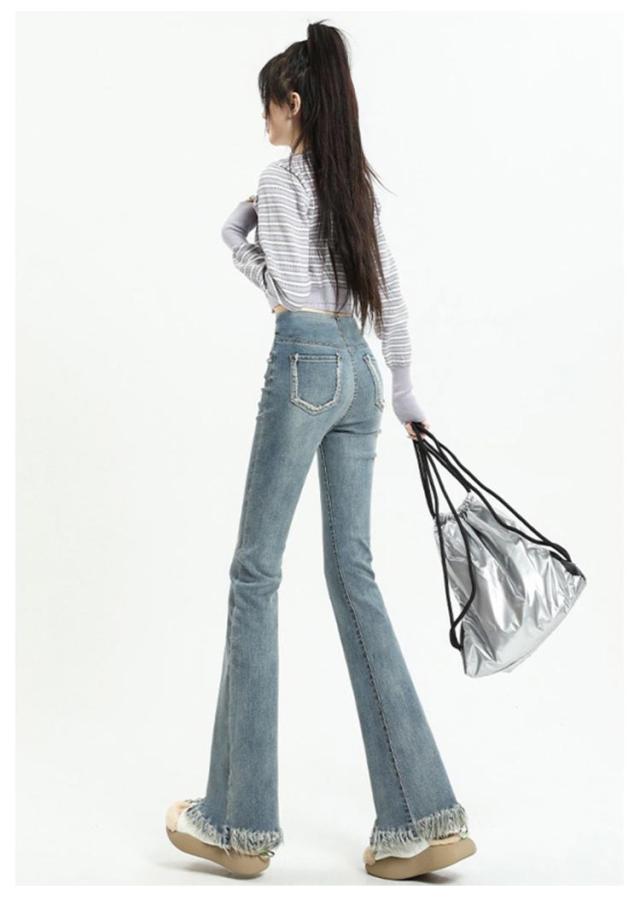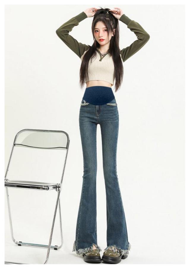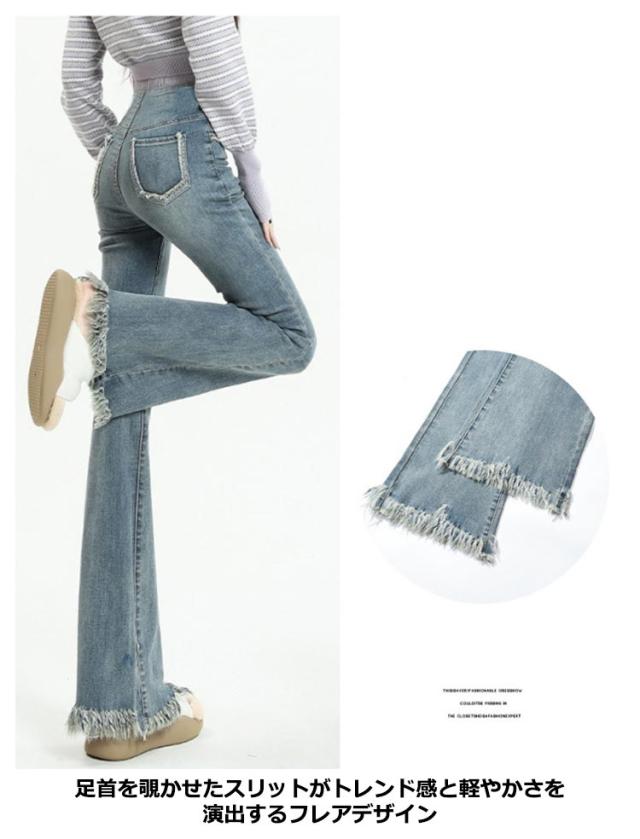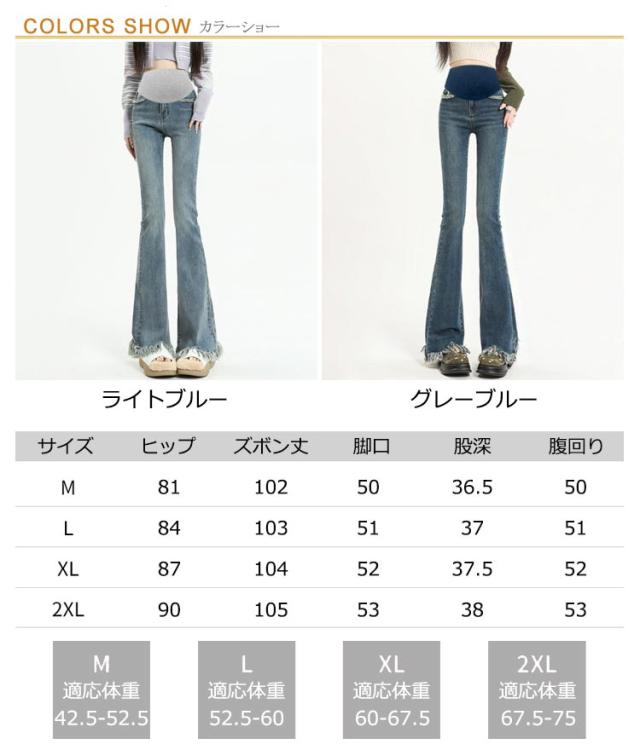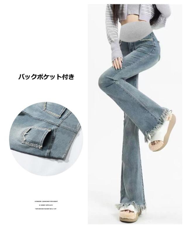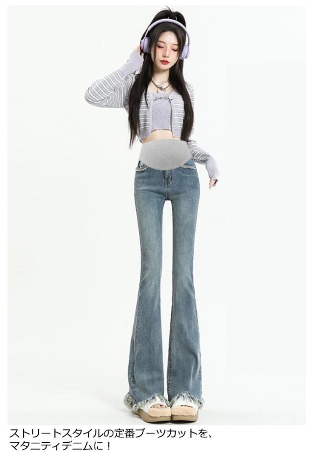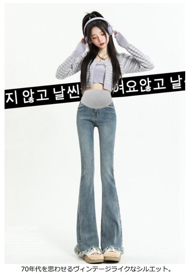 | 裾のフリンジでこなれ感もUP。 膝下からのフレアシルエットは足長・美脚効果大! ストリートスタイルの定番ブーツカットを、マタニティデニムに! 70年代を思わせるヴィンテージライクなシルエット。 理想的なボディラインと女性らしさが叶います。 ヒールにもスニーカーにも合う長さで、きれいめにもカジュアルにも幅広く活躍! ブーツや厚底に合わせるのも◎ トレンドのデザインなのでスタイリングに取り入れるだけでシンプルコーデも旬なルックに。 | |