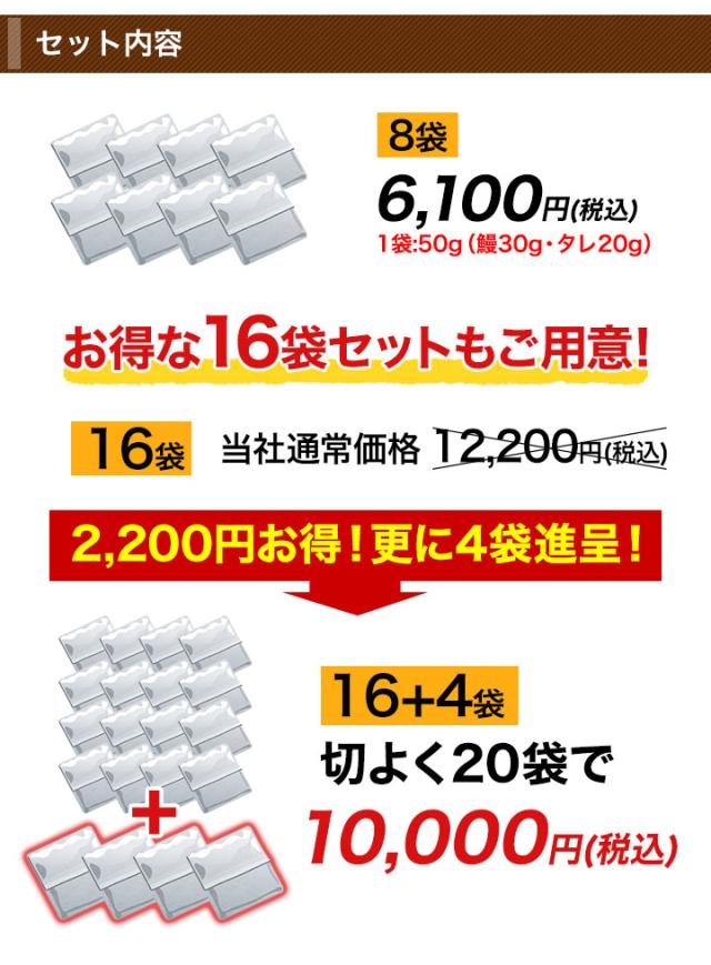 | セット内容 | 1袋内容:50g(鰻30g・タレ20g) (1)8袋(合計400g) (2)16+4袋(合計1kg) |