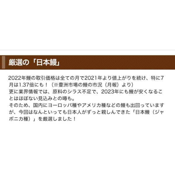 | 注意事項 | 解凍後はお早めにお召し上がり下さい。 食品につき、配送上の破損等以外の返品はご容赦下さい。 定期に関しましては、うなぎの市場価格が高騰した場合には、やむをえず、値上げをせざるを得ない可能性がございますのでご承知おきください。 |