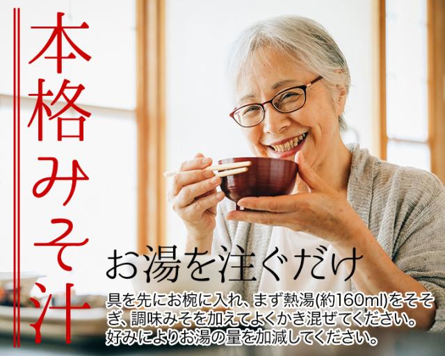 具を先にお椀に入れ、まず熱湯(約160ml)をそそぎ、調味みそを加えてよくかき混ぜてください。好みによりお湯の量を加減してください。 |
