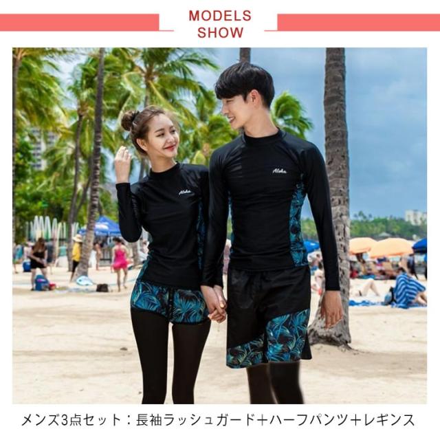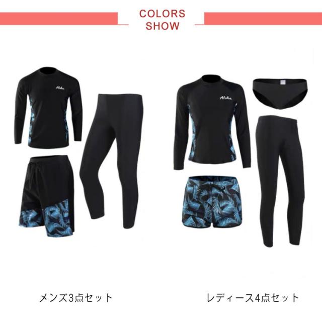 | 選べるメンズ水着3点セット・レディース水着4点セット メンズ3点セット:長袖ラッシュガード+ハーフパンツ+レギンス レディース4点セット:長袖ラッシュガード+ショートパンツ+ショーツ+レギンス 日焼け対策も体型カバーもでき、機能性とデザイン性を兼ね備えた水着セットアップ。 伸縮性があるので運動の妨げにならず、動きやすい! シンプルなデザインで幅広い年齢の方に着用していただけます。 ビーチ、プール、アウトドア、ウォーキング、ジョギング、ホットヨガなどレジャーから各種トレーニングまで幅広いシーンでお使いいただけます。 ご友人やカップル、ご夫婦、ご家族などお揃いでコーディネートを楽しむことができます。 | |
