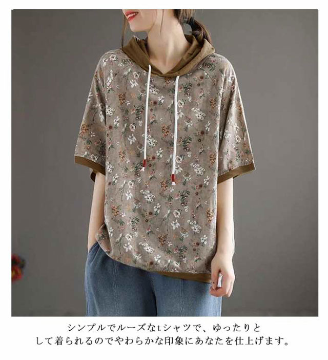 花柄 半袖シャツ パーカー レディース 半袖 フード付き Tシャツ 花柄 カットソー トップス フーディー 薄手 花柄Tシャツ 花柄パーカー チュニック プルオーバー シンプル 無地 夏物 カジュアル 体型カバー ブラウン ブルー