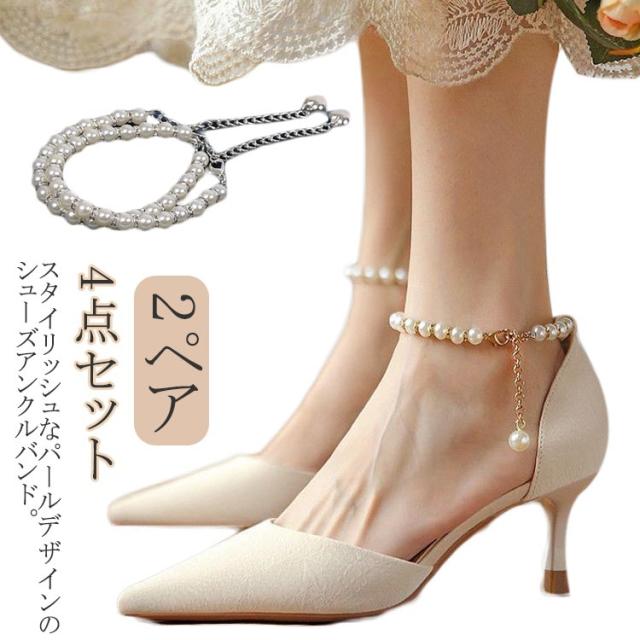 送料無料 シューズバンド パール シューズストラップ 靴 バンド 滑り止め 脱げ防止 4点セット 2ペア シューズチェーン アンクレット パンプス ベルト 後付け パール チェーン シューズベルト おしゃれ