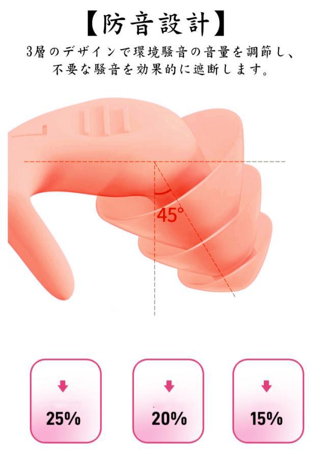 | 【快適なつけ心地】特殊形状の耳栓で、外耳道の形に合って、耳にフィット感よく、睡眠中に装着しても抜け落ちません。 【軽量】軽量なシリコン製で、就寝中等の長時間の使用でも耳が痛くならずに快適に過ごすことができます。 【高品質の材料】シリコン素材で柔らかくて快適で型崩れしにくく、防水性に優れ、水泳時にも使用できます。 【防音設計】3層のデザインで環境騒音の音量を調節し、不要な騒音を効果的に遮断します。 【繰り返し使用可能】汚れても水洗いすれば清潔に再使用でき、衛生的です。 【幅広い適用場所】仕事中・勉強・睡眠時・公共機関など 周囲の音がきになる時に装着頂くことで耳に不快な音を遮音してくれます。 | |