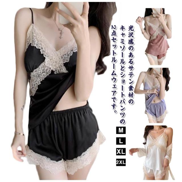| 光沢感のあるサテン素材のキャミソールとショートパンツの2点セットルームウェアです。 大人可愛いデザインでルームウェアとしてもオススメです。 のんびり、リラクゼーションに最適で、仕事で疲れた一日の後に着用するのに最適です レース切り替えと女性らしさを演出。 ナイトウェア、デザイン良くて作りも素敵です。柔らかな滑らかなソフトで快適な肌触り感!良質な睡眠も幸せ感も満点です。 | |