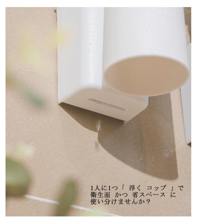 | 毎日の 歯磨き や うがい に 必須 の 洗面所 の コップ 。 衛生面 を考えると 家族別々の コップ を 使いたいけれど 洗面台 は 置き場所がなくて困る…。 このアイテムなら ペタッと壁に貼りついて 省スペース で 家族の コップ を置けちゃいます。 浮かせて 逆さまに 収納 する事で 水切れ が抜群に良くなって 水垢 や ヌメリ がつきにくく 衛生面 も 安心 。 1人に1つ「 浮く コップ 」で 衛生面 かつ 省スペース に 使い分けませんか? | |