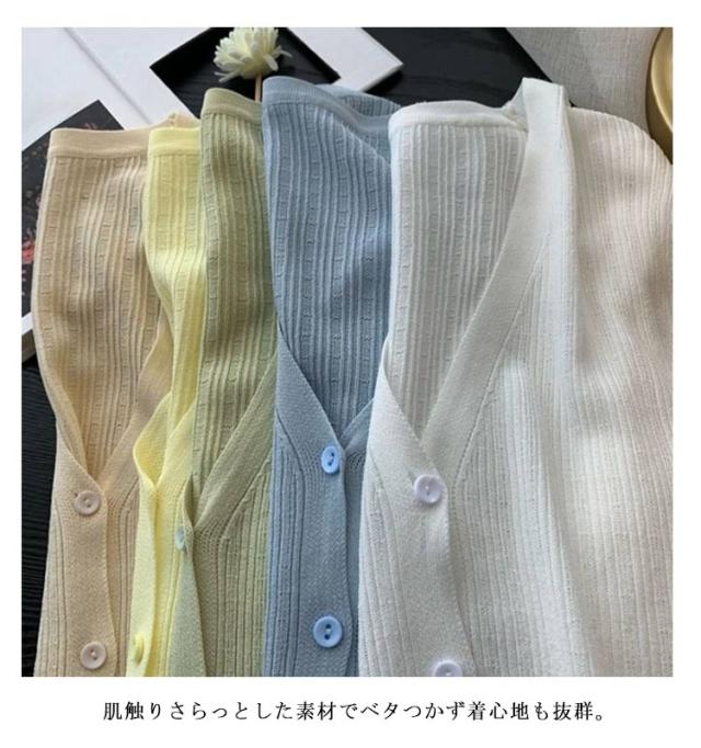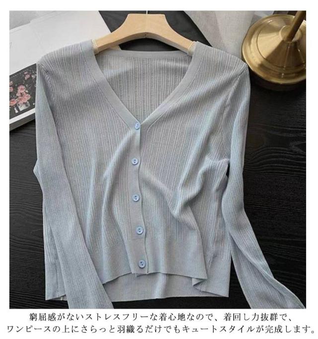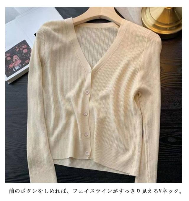 | 素材が軽やかな印象のカーディガン。 肌触りさらっとした素材でベタつかず着心地も抜群。 日差しの強い時期にUVカットし、紫外線からお肌を守ります。 前のボタンをしめれば、フェイスラインがすっきり見えるVネック。 窮屈感がないストレスフリーな着心地なので、着回し力抜群で、ワンピースの上にさらっと羽織るだけでもキュートスタイルが完成します。 | |