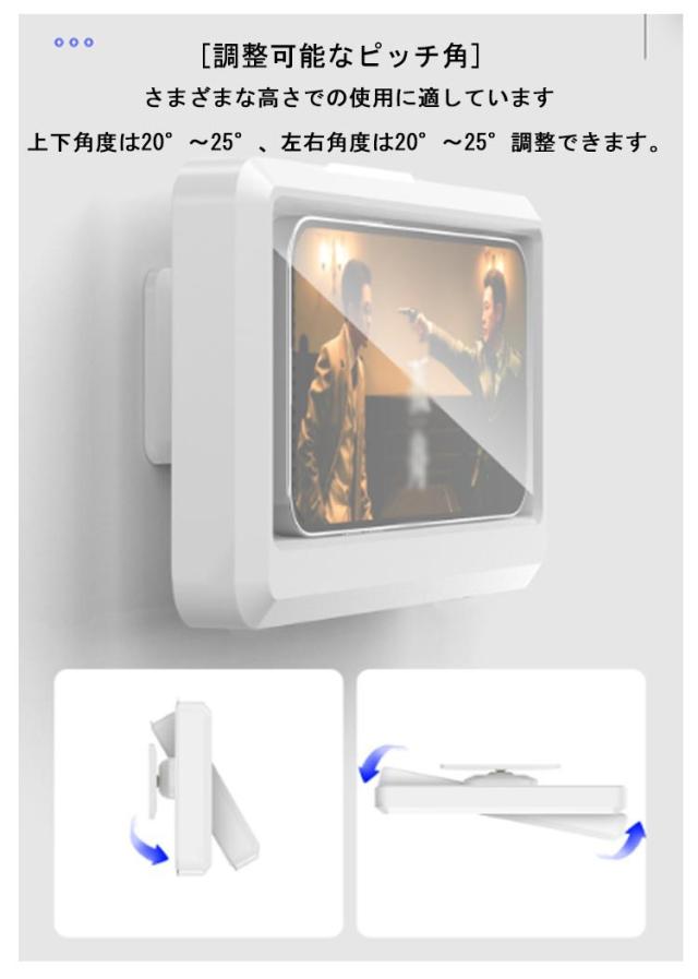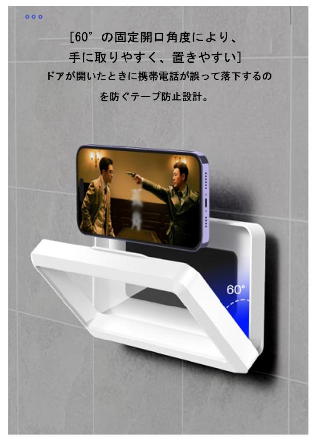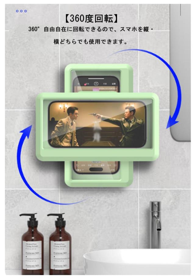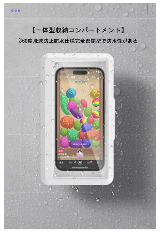 | 【壁掛け&スタンド2WAY】 2WAY仕様なので、「お風呂」「キッチン」「洗面所」「ベッドサイド」「化粧台」等、使いたい場所ですぐに使えます。 【360度回転】 360°自由自在に回転できるので、スマホを縦・横どちらでも使用できます。 【一体型収納コンパートメント】360度飛沫防止防水仕様 完全密閉型で防水性がある [調整可能なピッチ角] さまざまな高さでの使用に適しています 上下角度は20°〜25°、左右角度は20°〜25°調整できます。 [60°の固定開口角度により、手に取りやすく、置きやすい] ドアが開いたときに携帯電話が誤って落下するのを防ぐテープ防止設計。 【6.8インチ以下の携帯電話に対応】 【センシティブタッチ】高感度タッチフィルム、濡れた手でもスムーズな滑り 【クリアな視界を実現する疎水性スクリーンフィルム】透明度の高いPET、色差なし、障害物なし、没入型の視覚体験 【パンチ不要で跡が残らないステッカー】簡単に貼れて壁を傷つけません。 | |
