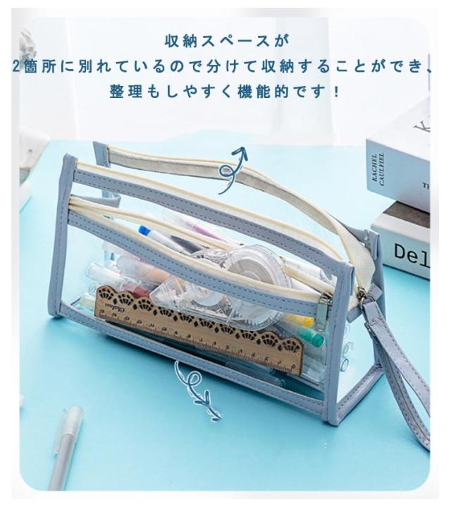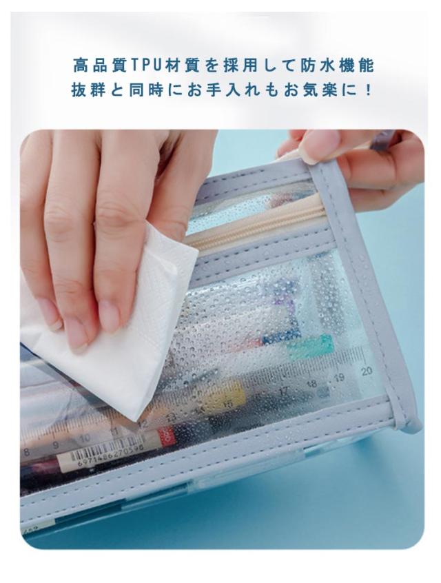 | 便利な2ルーム仕様で大容量のペンケース! 収納スペースが2箇所に別れているので分けて収納することができ、整理もしやすく機能的です! 高品質TPU材質を採用して防水機能抜群と同時にお手入れもお気楽に! しっかりと自立する三角デザインなので開いた時には中身がこぼれることがなくペンケースは机の上に置きやすいです。 透ける筆箱なのでどこに何が入っているのか探しやすいです。 開けたら口が大きくなるところも、このふでばこの使いやすいところです。メガネ収納にも使えます。 | |