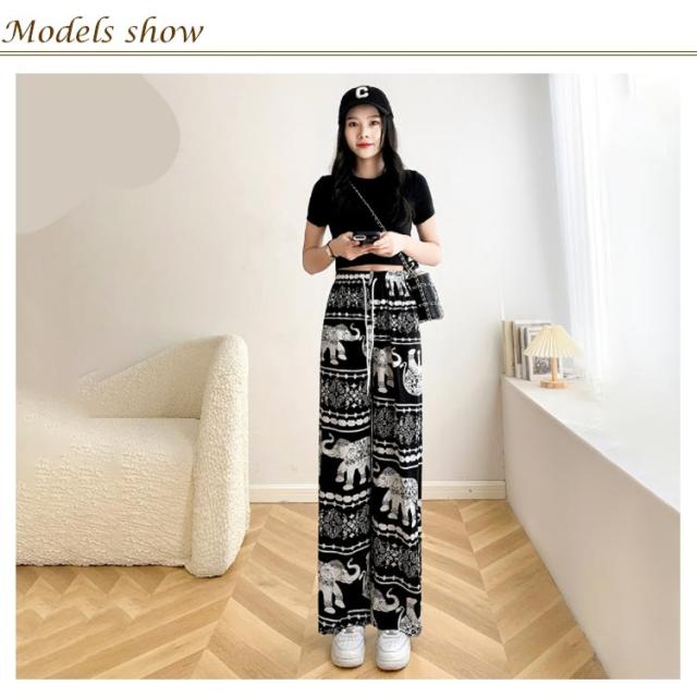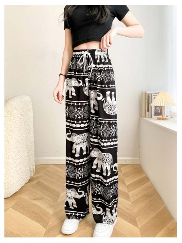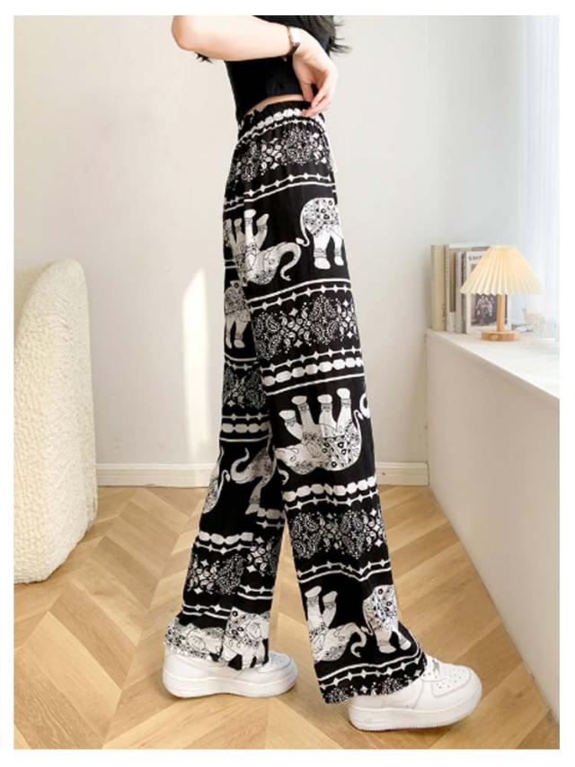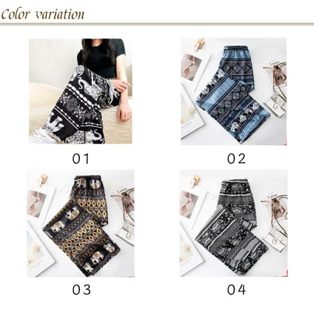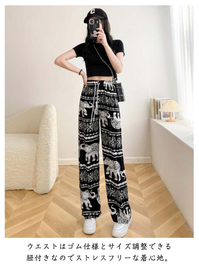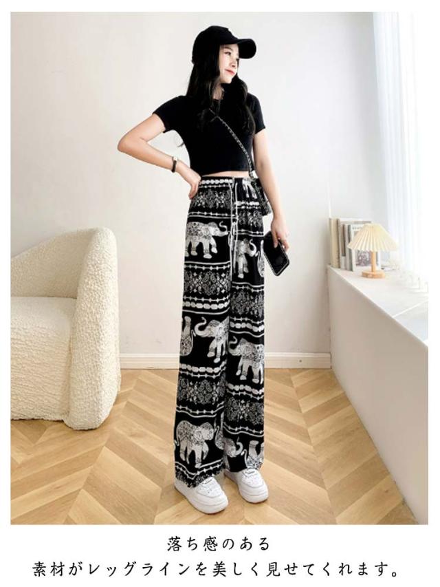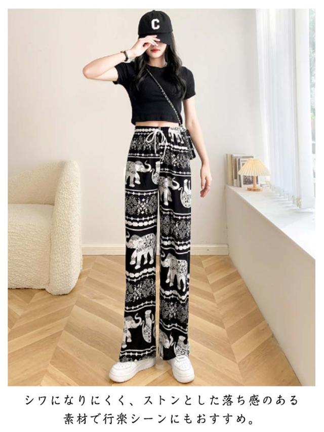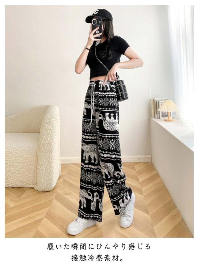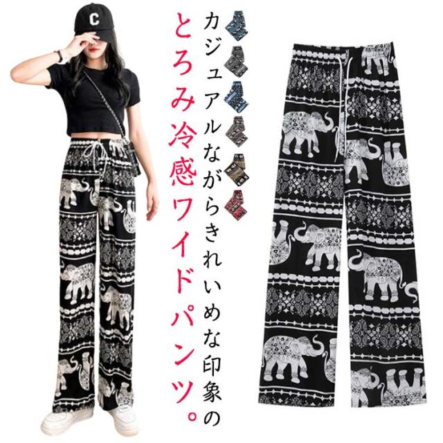 接触冷感 ワイドパンツ 総柄 レディース タイパンツ ゾウ 柄 パンツ リラックスパンツ ルームウエア ロングパンツ 薄手 涼感 アイス シルク パンツ 部屋着 落ち感 涼しい 通気性 体型カバー ハイウエスト ウエストゴム ストレッチ カジュアル 送料無料
