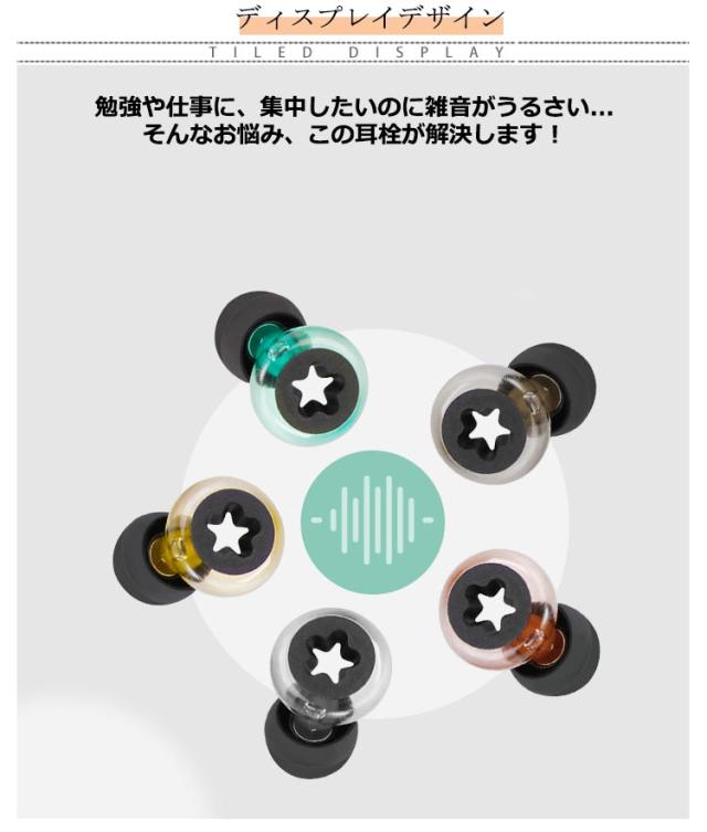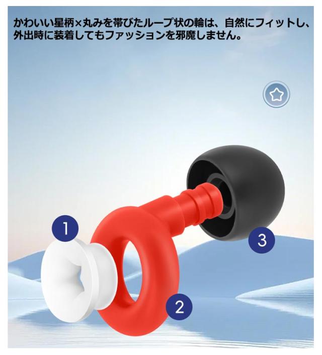 | 高性能のシリコンフィルターを採用した遮音耳栓。 勉強や仕事に、集中したいのに雑音がうるさい...そんなお悩み、この耳栓が解決します! 抜群の遮音性で、睡眠時・仕事中・勉強・公共機関など周囲の音が気になる時に装着することで不快な音を遮音してくれます。 かわいい星柄×丸みを帯びたループ状の輪は、自然にフィットし、外出時に装着してもファッションを邪魔しません。 就寝時など長時間装着しても耳への疲れ・違和感がありません。 寝返りの際に痛くなりにくく邪魔になりにくい耳栓です。 イヤーピースが3サイズ付属しているので、ご自身の耳に合うサイズをお選びいただけます。 | |