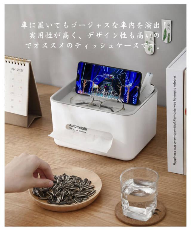 | 蓋を開いてティッシュを入れるだけです。 ティッシュや小物も収納できる多機能が魅力。 自宅やオフィスなどで、小物をすっきりまとめたいときに重宝します。 横向きにティッシュを取り出すのもとってもおしゃれです。 車に置いてもゴージャスな車内を演出!実用性が高く、デザイン性も高いのでオススメのティッシュケースです。 | |