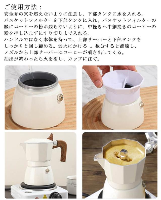 | 直火式エスプレッソメーカー 【電源不要で場所を選ばず利用可能】直火式エスプレッソメーカーは電気を使わないのでガスコンロやアウトドア用のバーナーで手軽に使えます。 おうちだけでなく、キャンプや登山などアウトドアでも本格的なエスプレッソを楽しむことができます。 【エコフレンドリーな選択】電気を消費しない直火式エスプレッソメーカーは環境に優しい選択肢。毎日のコーヒータイムがよりエコロジカルになります。 【独特の味わいを楽しめる】直火式エスプレッソメーカーで淹れたコーヒーは独特の風味と香りが特徴。一度その味わいを知ってしまうと、もう手放せなくなること間違いなしです。 【コーヒー作りの過程を楽しむ】豆を挽いて、直火式エスプレッソメーカーで抽出する手間を楽しめるのも魅力の一つ。コーヒー作りをじっくりと楽しむことができます。 【おしゃれなデザインでインテリアに】直火式エスプレッソメーカーは、機能性だけでなく、デザイン性にも優れています。キッチンやリビングに置いておくだけで、おしゃれな空間を演出できます。 【手入れのポイント】適切なメンテナンスを行うことで、直火式エスプレッソメーカーは長く愛用できます。定期的にパーツを分解して、丁寧に洗浄しましょう。 ご使用方法: 安全弁の穴を超えないように注意し、下部タンクに水を入れる。 バスケットフィルターを下部タンクに入れ、バスケットフィルターの縁にコーヒーの粉が残らないように、中挽きへ中細挽きのコーヒーの粉を押し込まずにすり切りまで入れる。 ハンドルではなく本体を持って、上部サーバーと下部タンクをしっかりと回し締める。弱火にかける 。数分すると沸騰し、ノズルから上部サーバーにコーヒーが噴き出してくる。 抽出が終わったら火を消し、カップに注ぐ。 | |