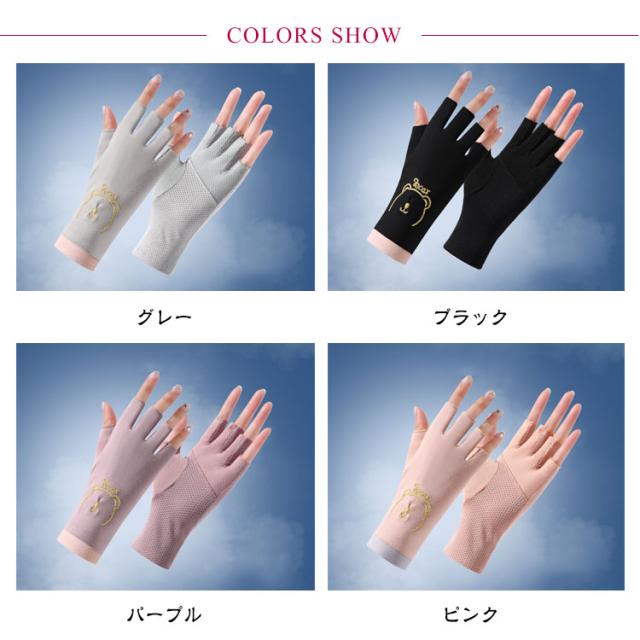 | かわいいクマさんの刺繍柄のUVカット手袋 ひんやり涼しい UPF50+ メッシュで通気性抜群 着けた瞬間、ひんやり〜「接触冷感」素材採用、蒸し暑さの不快感を軽減! 手のひら側はメッシュで快適な通気性。さらに保湿性も抜群! 指の先は途中でカットされているデザインなので、装着したままスマホの操作が可能。 少し長めのデザインなので、手首部分までしっかり紫外線からガードしますので日焼け対策にぴったりです。 | |