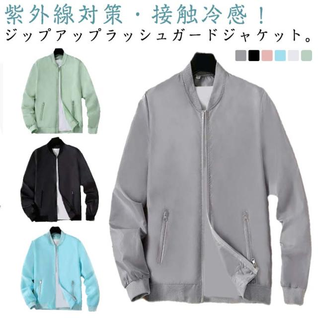 メンズ ラッシュガード ジャケット ノーカラー UVカット 長袖 スタジャン ブルゾン 紫外線対策 夏用 ひんやり 接触冷感 薄手 ジャケット 吸汗速乾 日焼け防止 ジャンパー 冷房対策 無地 軽量 ジップアップ 送料無料