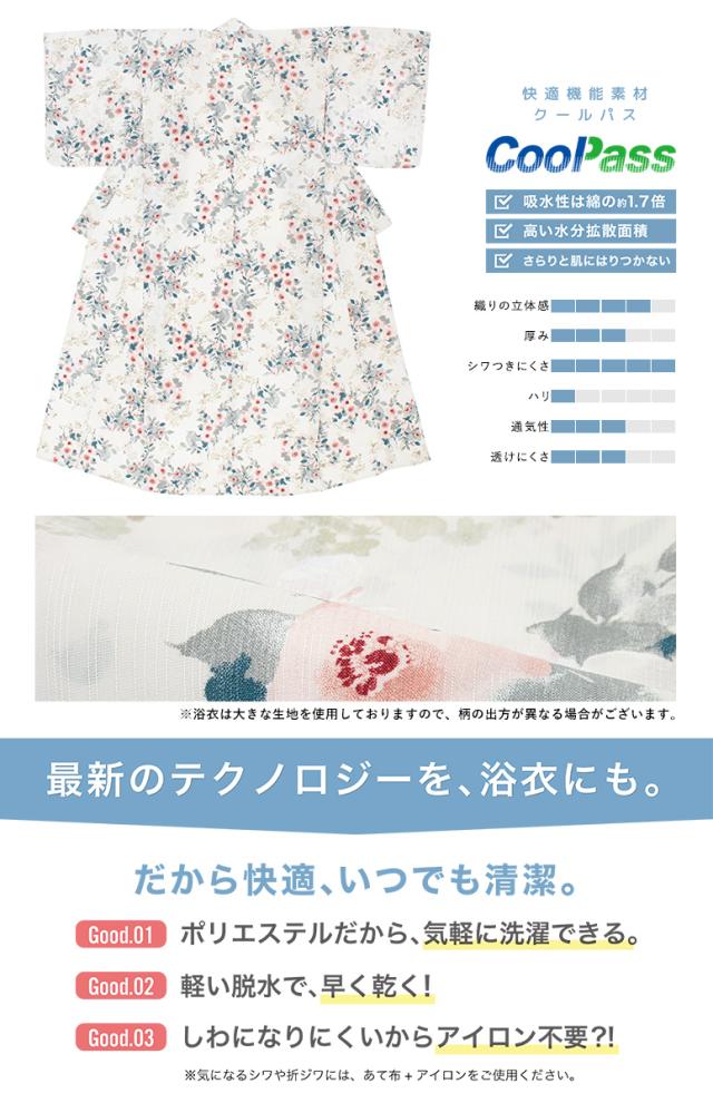 新作のレディース【浴衣・帯・下駄】の3点セットです。 浴衣生地は、ひんやりとした肌触りの涼やかなポリエステル素材で、吸汗性と速乾性の繊維のCoolPassを使用しています。 帯は化繊素材です。 仕立て上がりですので、お届け後すぐにお召しいただけます。