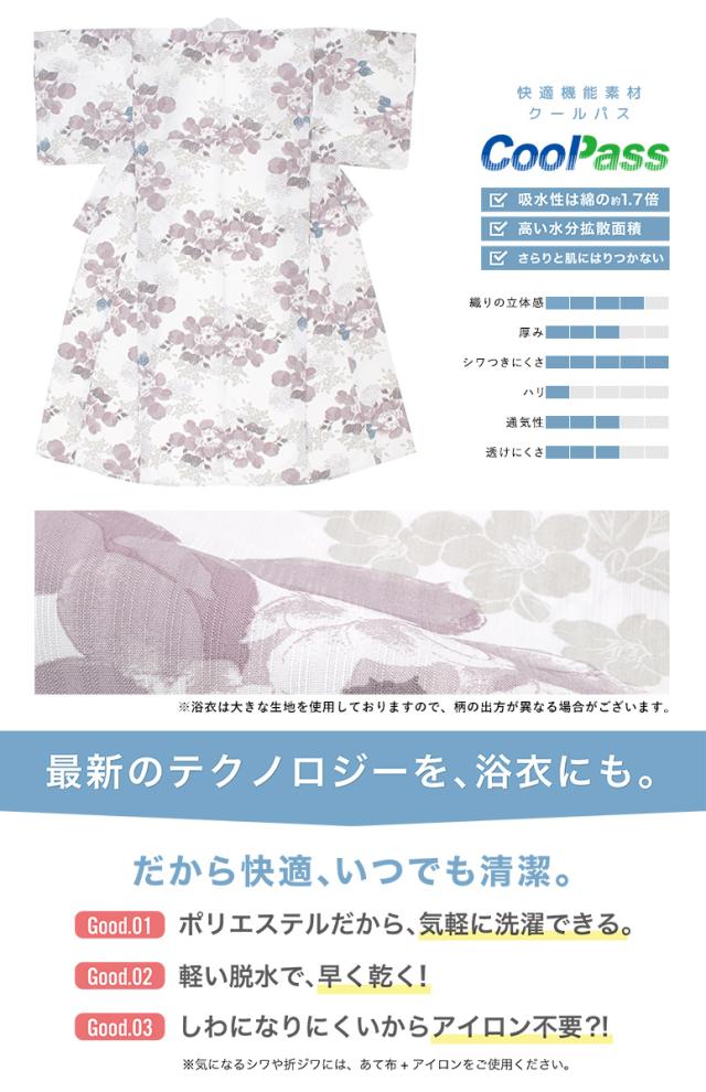新作のレディース【浴衣・帯・下駄】の3点セットです。 浴衣生地は、ひんやりとした肌触りの涼やかなポリエステル素材で、吸汗性と速乾性の繊維のCoolPassを使用しています。 帯は化繊素材です。 仕立て上がりですので、お届け後すぐにお召しいただけます。