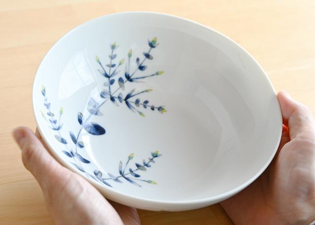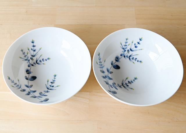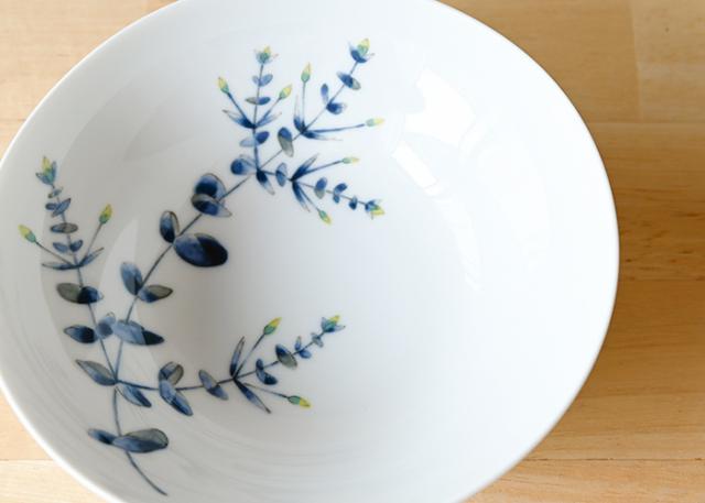 アンティークな色合いの葉が美しいユーカリをモチーフに透明感のある水彩画タッチで描いたペア中鉢(ボウル)です。ゆるやかな風に揺れるユーカリの枝と吹き抜ける爽やかな香り、その瞬間を切り取って表現したデザインです。 色々なシーンでお使いいただける使い勝手の良い大きさと形状です。