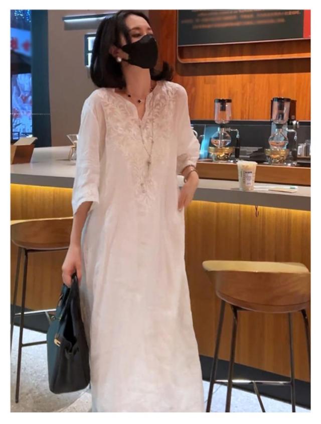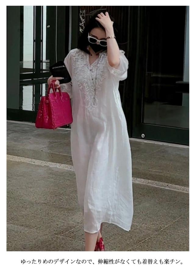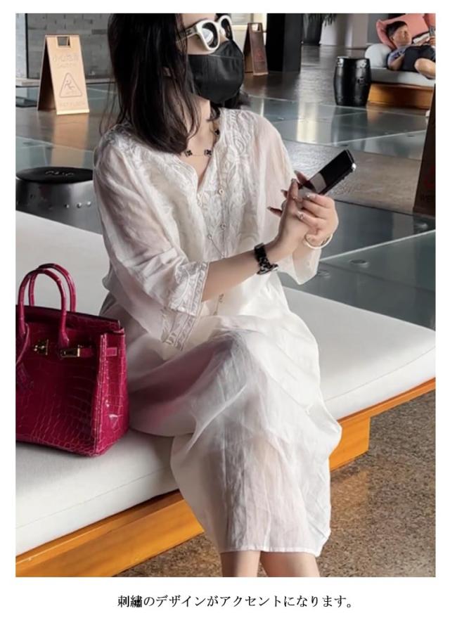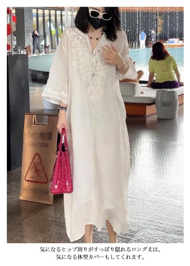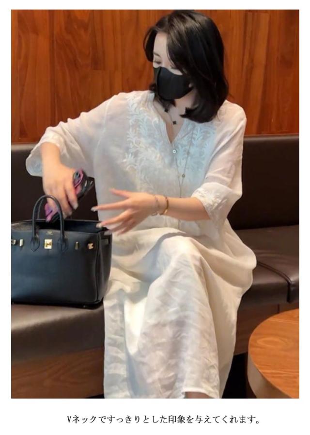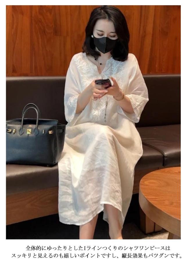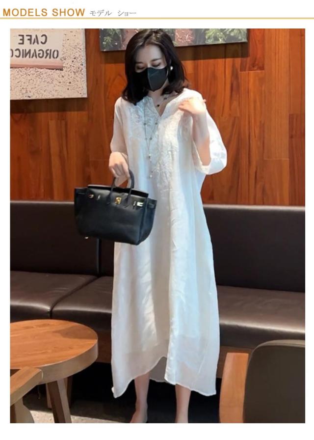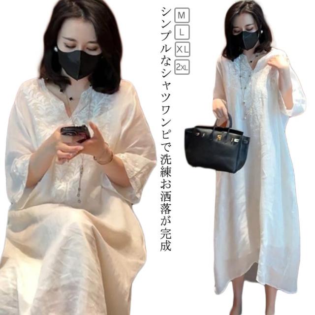 シャツワンピース Vネック マキシワンピース レディース ロング 夏 春 大きいサイズ 7分袖 ワンピース ロングシャツワンピース 白ワンピース レース きれいめ プルオーバー 長袖 大人女性 可愛い 体型カバー 快適 リゾート 旅行 かわいい ギフト プレゼント 送料無料