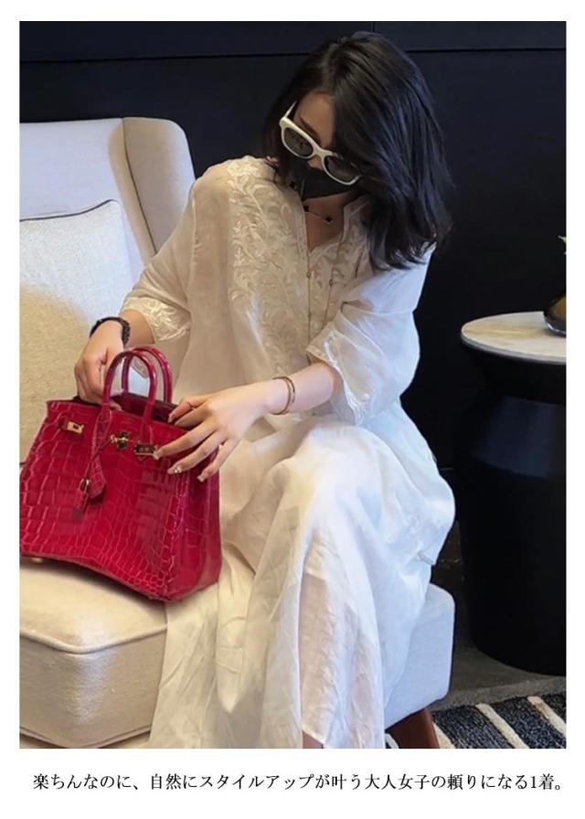 | シンプルなシャツワンピで洗練お洒落が完成 全体的にゆったりとしたIラインつくりのシャツワンピースはスッキリと見えるのも嬉しいポイントですし、縦長効果もバツグンです。 Vネックですっきりとした印象を与えてくれます。 気になるヒップ周りがすっぽり隠れるロング丈は、気になる体型カバーもしてくれます。 ゆったりめのデザインなので、伸縮性がなくても着替えも楽チン。 刺?のデザインがアクセントになります。 楽ちんなのに、自然にスタイルアップが叶う大人女子の頼りになる1着。 | |