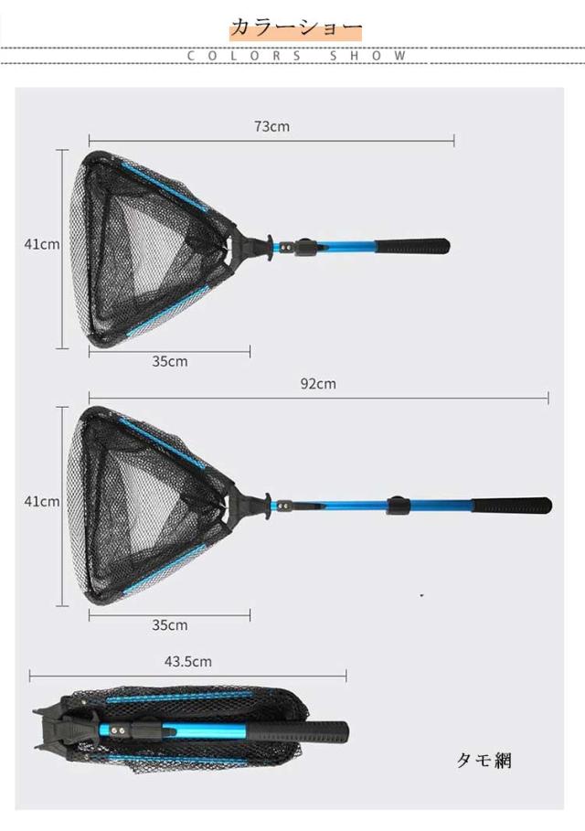 | サイズについての説明 | 全長:92cm、収縮時:73cm、収納時:43.5cm、重量:438g、網の幅:41*35m、網の深さ:35cm ※サイズ表の実寸法は商品によって1-3cm程度の誤差がある場合がございます。 |