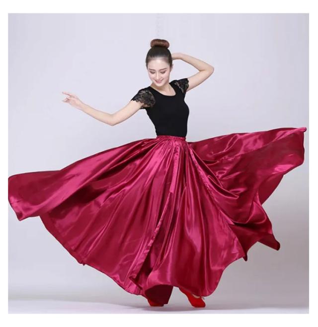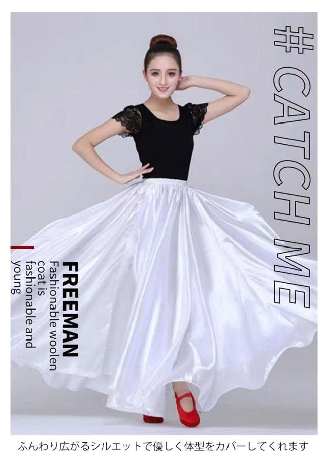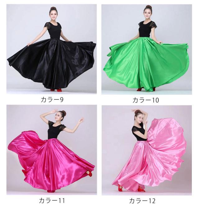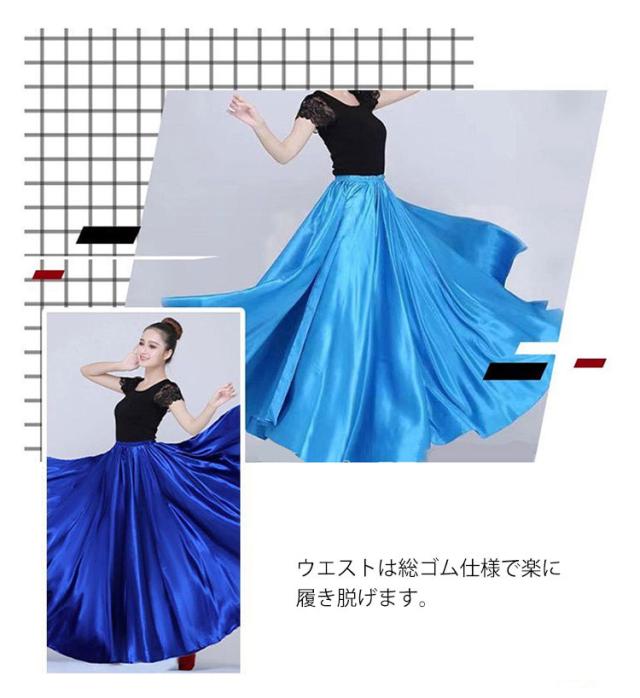 ダンススカート フレアスカート ロング丈 80cm/85cm/90cm 360度 540度 720度 ロングスカート ウエストゴム ステージ衣装 演奏会 舞台衣装 光沢 無地 練習着 レッスンウェア 社交ダンス ベリーダンス ダンス衣装 ラテンダンス パソドブレ フラメンコ