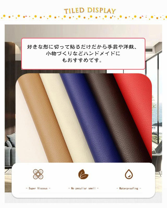 | 合皮シート、5枚入りです。 ソファや椅子などの家具やインテリアの皮製品、自動車やバイクのシートや内装、バックの底あて、財布やキーケース、ベルトなどの小物まで、幅広い革製品の修復にご利用いただけます。 好きな形に切って貼るだけだから手芸や洋裁、小物づくりなどハンドメイドにもおすすめです。 粘着でしっかり貼り付けできます。 PUレザーで高級感バッチリです。 | |
