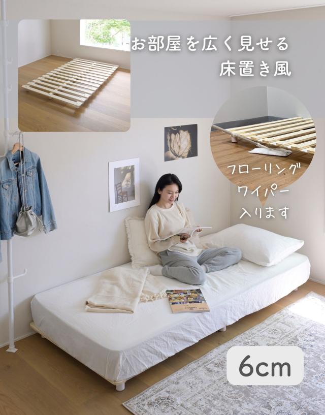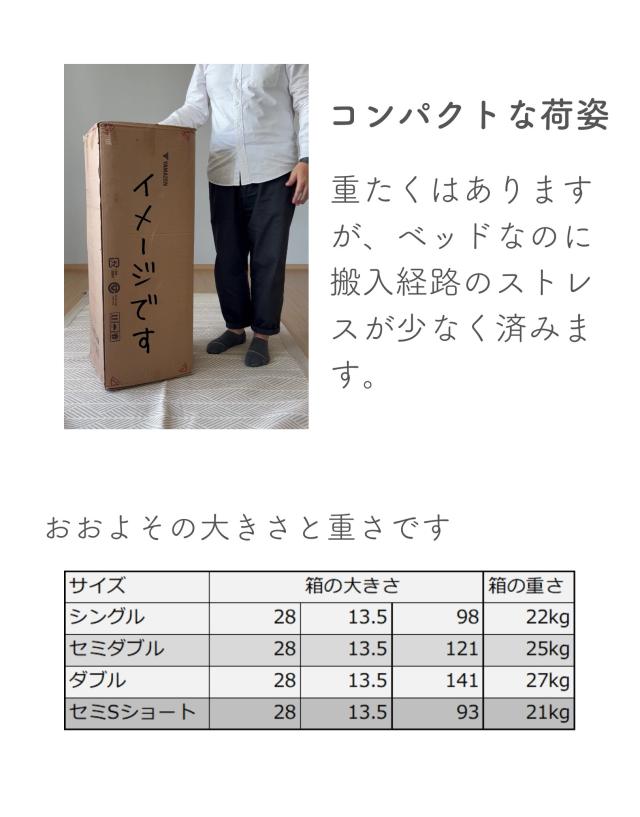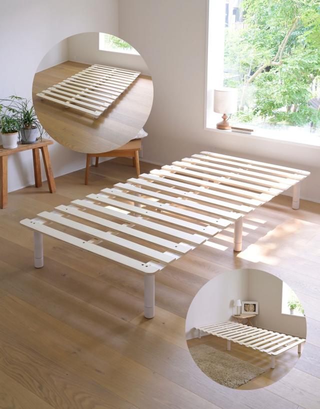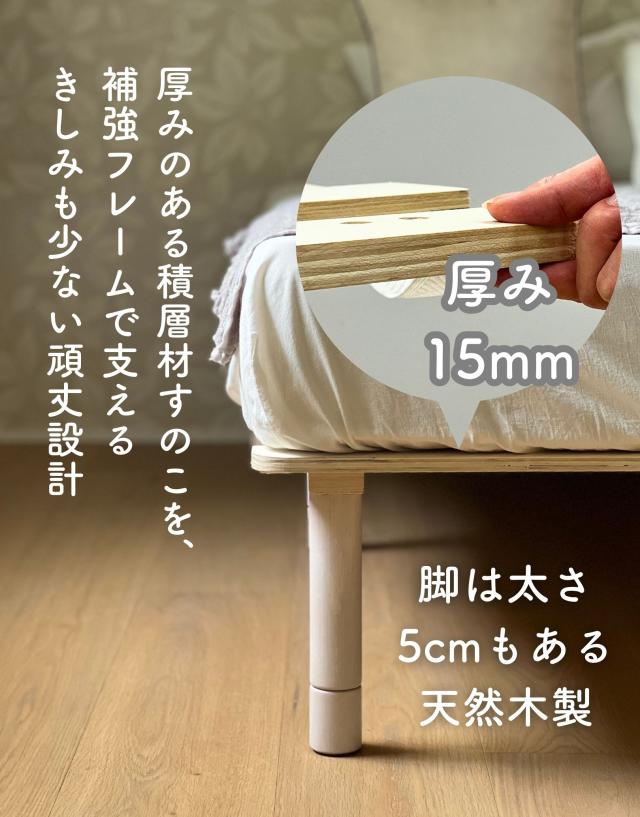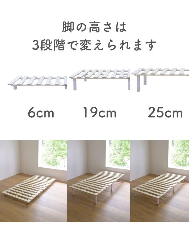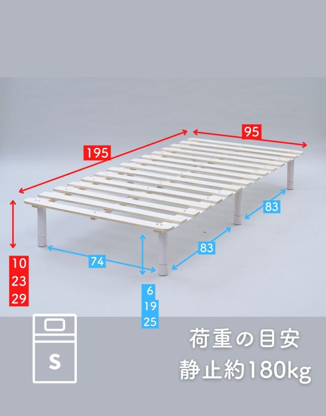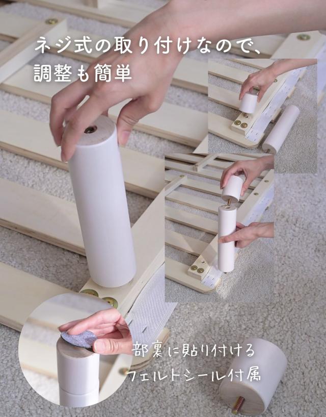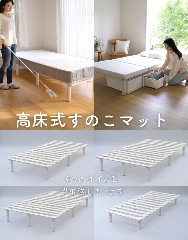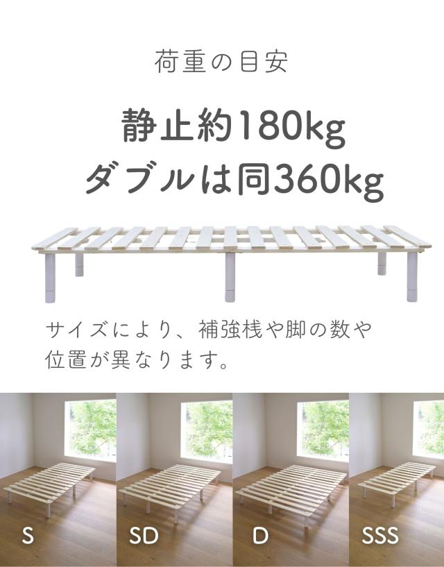 | 商品説明 | ●マットレス下の通気を良くし、掃除もしやすくする高床式すのこマット ●4つのサイズをご用意: シングル、セミダブル、ダブル、セミシングルショート ●マットレスが浮いてるような、見た目もすっきりなヘッドレススタイル ●すのこが予め連結されていて、組み立て簡単、分解も可能 ●脚の高さは3段階で変更可能: 6/19/25cm ●脚はネジ式の取り付けなので、調整も簡単 ●脚部裏に貼り付けるフェルトシール付属 ●厚み2mmのある積層材すのこを補強フレームで支える、きしみも少ない頑丈設計 ●荷重の目安:静止約180kg(ダブルは同360kg) ●重たいながら、搬入経路のストレスが少なく済むコンパクトな荷姿 |