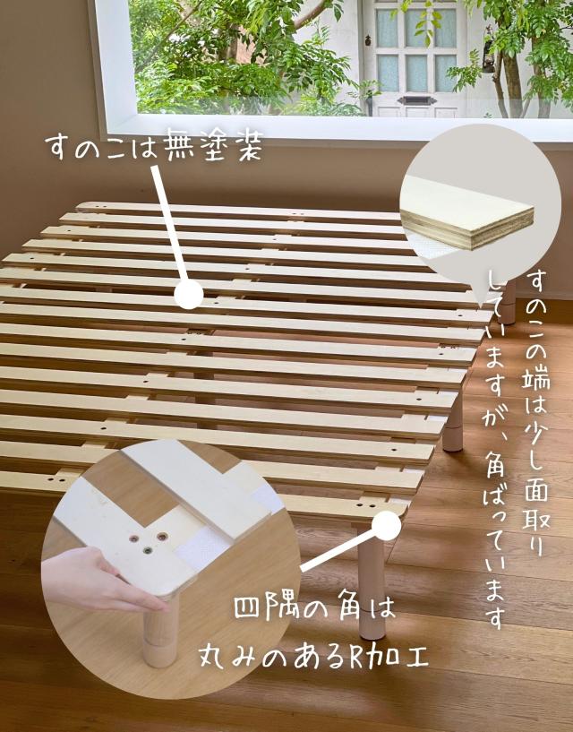 - すのこがつながった状態なので組み立てが簡単で、30分程で完成しました。軋む音などないか心配しましたがしっかりしているので大丈夫でした。マットレスなしで直接布団を置いていますが、すのこの隙間が気になる方...