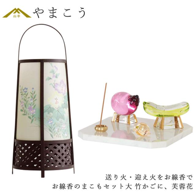 盆提灯 初盆 モダン お盆 提灯 新盆 お盆飾り 仏具 お線香のまこもセット 大 岐阜の誉れ シリーズ 竹かごに、芙蓉花 お盆用品 お供え おしゃれ 送り火 迎え火 真菰 精霊馬 焙烙皿