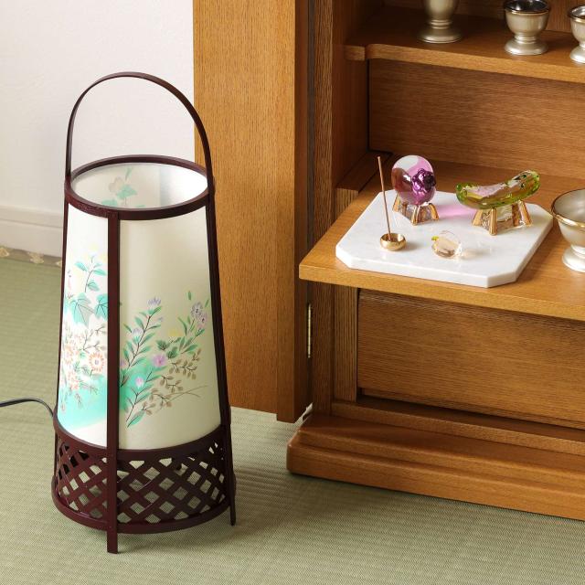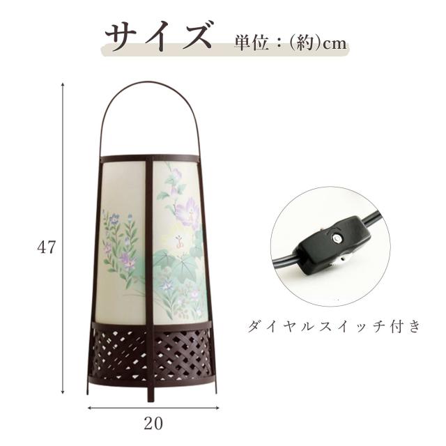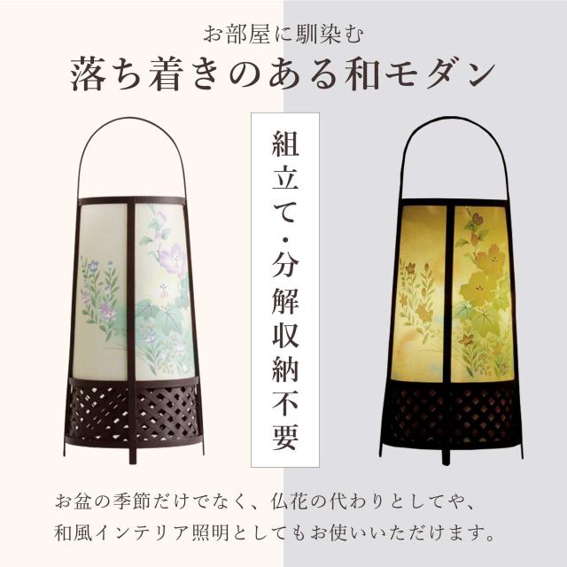竹で編んだフレームに淡い芙蓉花の火袋、回転筒は野菊をイメージした和のテイストが詰まっています。スイッチを入れれば床面まで美しく照らし出す、計算された手の込んだ作り。明りを灯さなくても、置型の丸い行灯はお部屋になじむインテリア用品として、季節を問わず楽しむことができます。