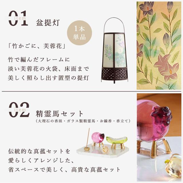 天然大理石の美しい光沢と、質感。火の元に不安がなく、美しくお盆飾りができます。ガラス製の精霊馬、精霊牛とほおずきは、クリスタルの輝き。伝統的な真菰セットを愛らしくアレンジ、毎年使える耐久性もうれしい、機能美あふれる一式です。