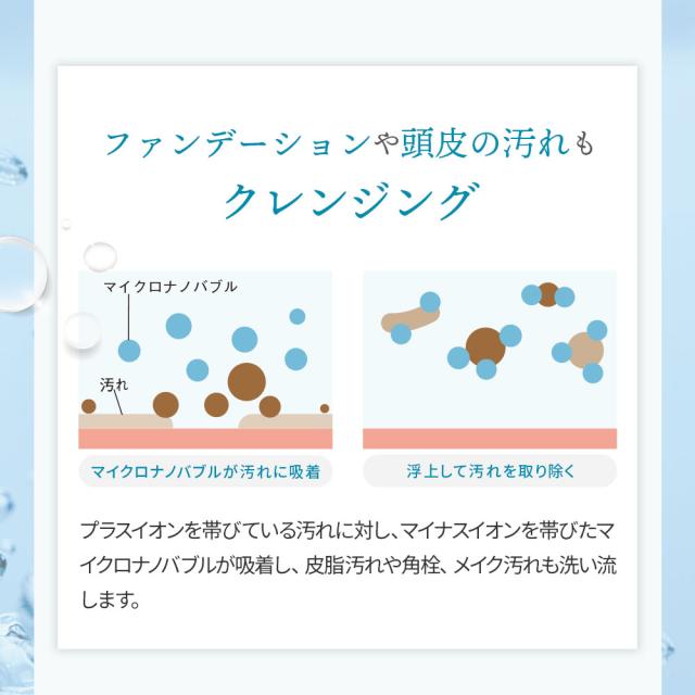 ◯プラスイオンを帯びている汚れに対し、マイナスイオンを帯びたマイクロナノバブルが吸着し、皮脂汚れや角栓、メイク汚れも洗い流します。