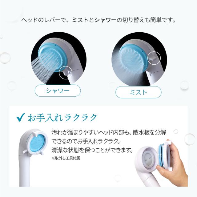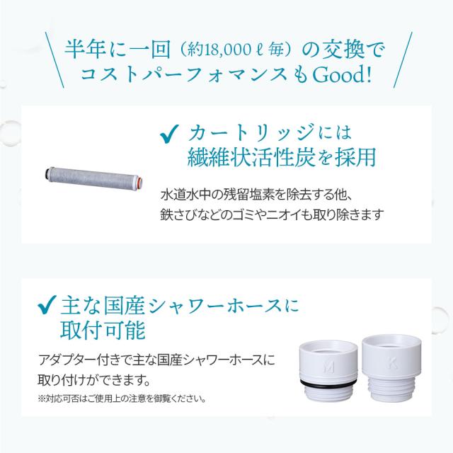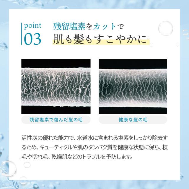 活性炭の優れた能力で、水道水に含まれる塩素をしっかり除去するため、キューティクルや肌のタンパク質を健康な状態に保ち、枝毛や切れ毛、乾燥肌などのトラブルを予防します。